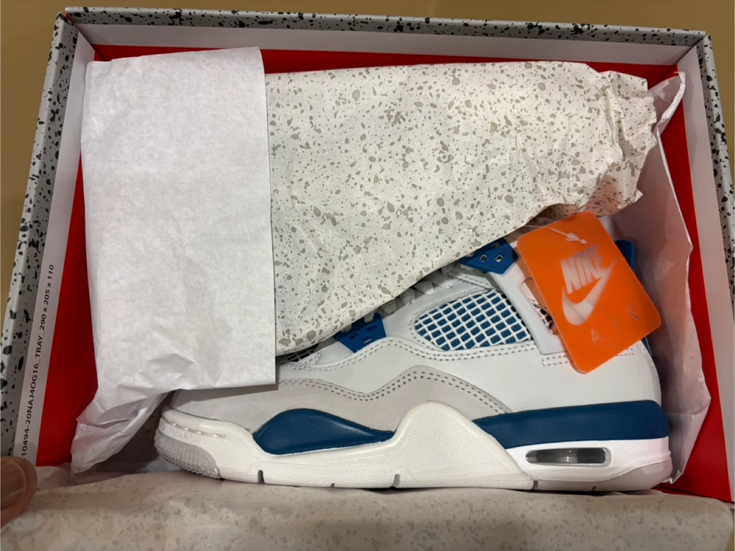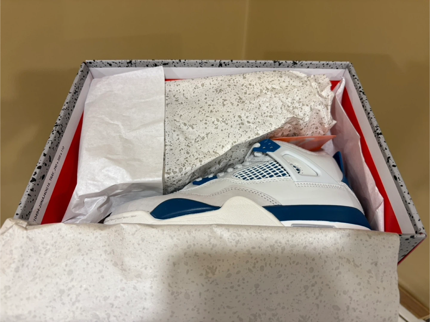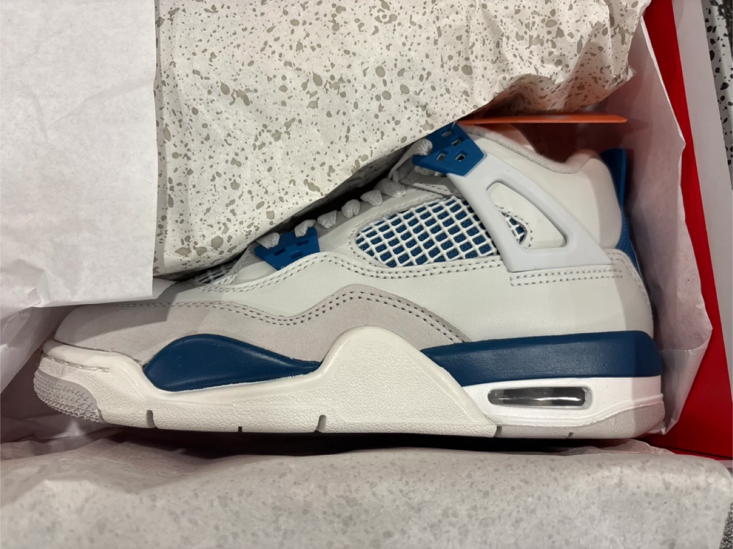 Selling a brand new pair of Air Jordan 4 Retro (GS) in size 4Y. They are white, off-white, and military blue. Comes with the original box!