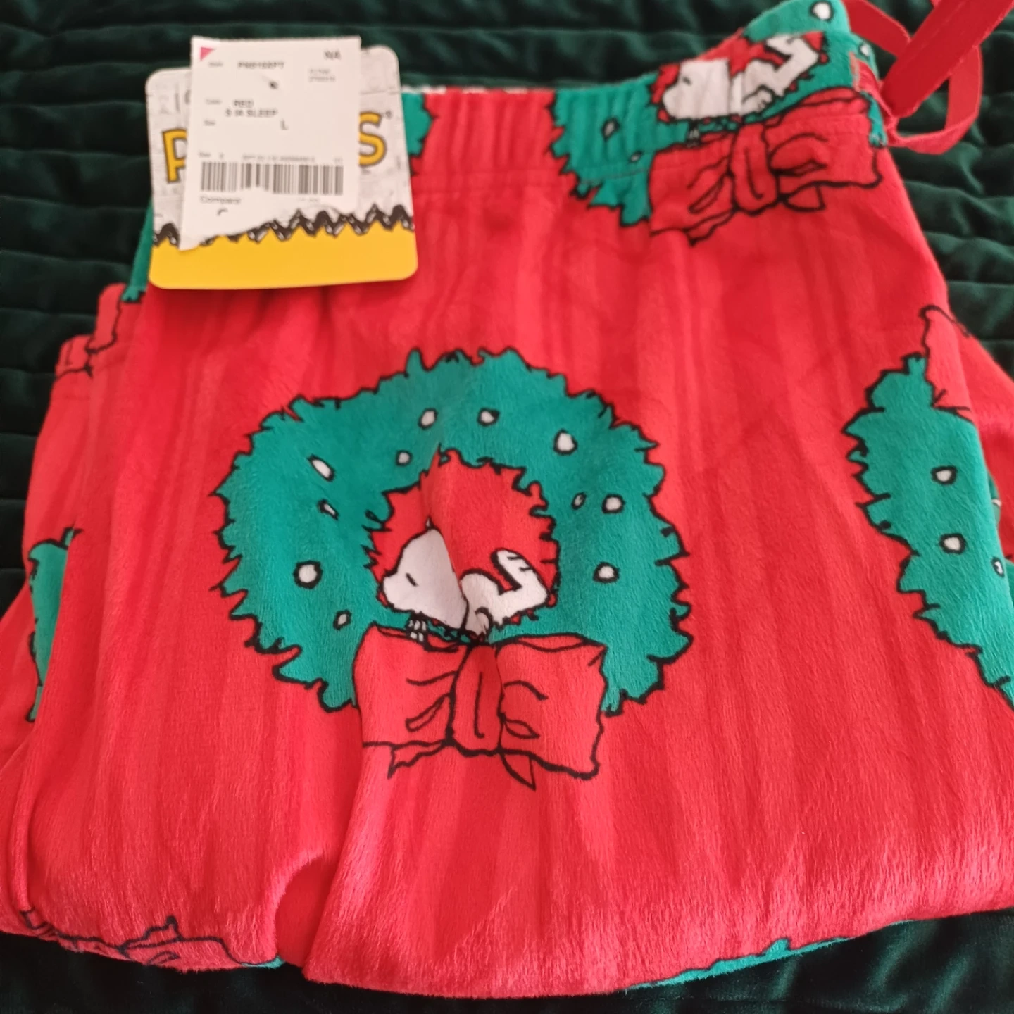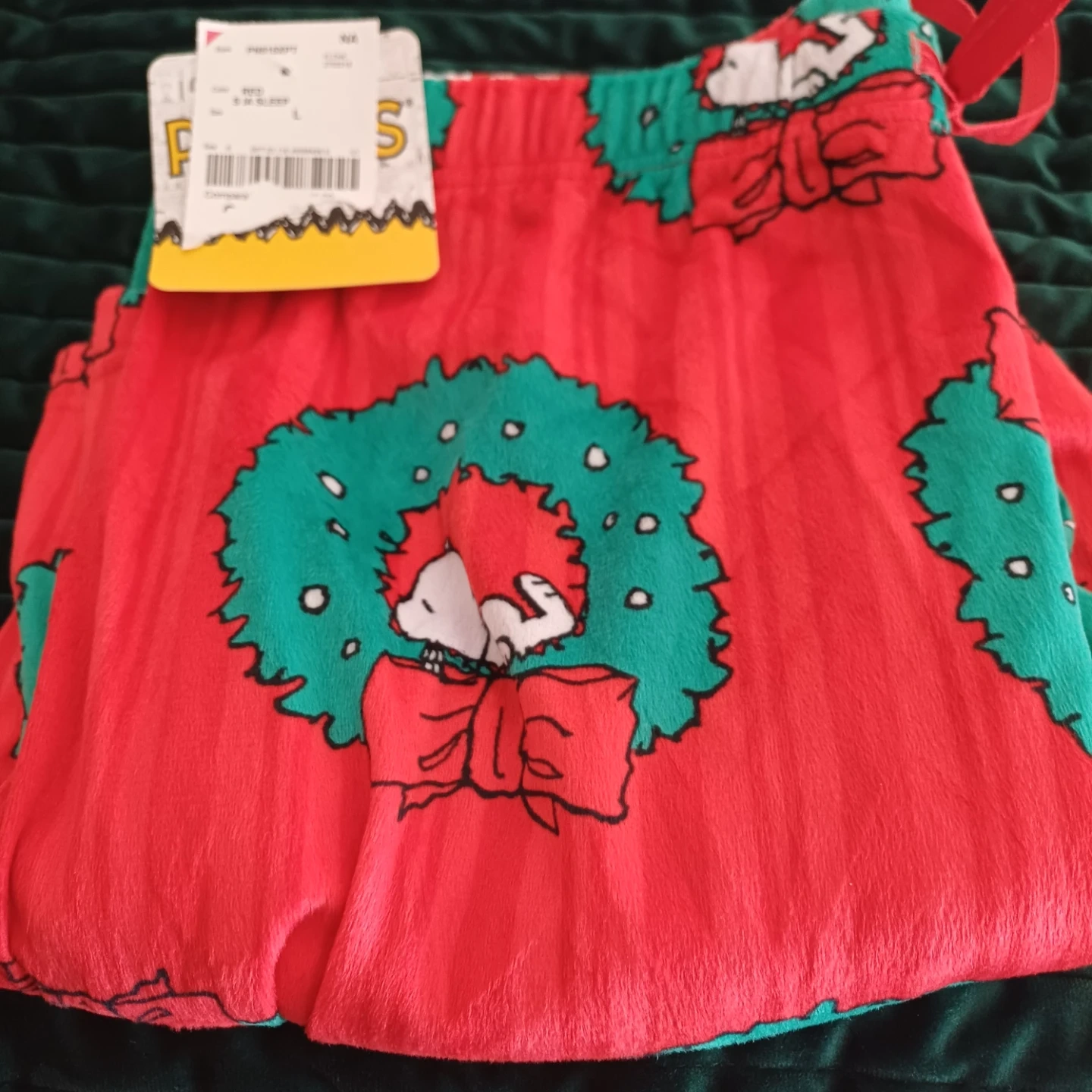 Get ready for the holidays with these adorable Peanuts Snoopy pajama pants! They are brand new with tags and feature a festive wreath and bow design. The size is L.