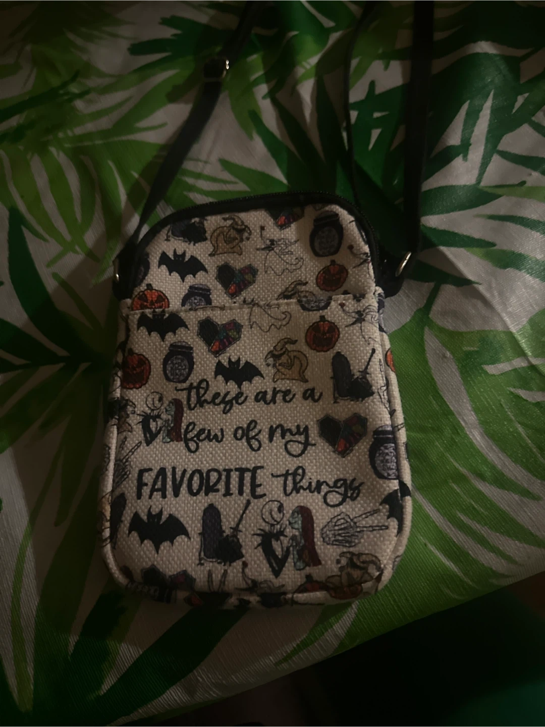 Super cute crossbody bag featuring designs from The Nightmare Before Christmas! It says "These are a few of my FAVORITE things" and has Jack Skellington, Sally, bats, and pumpkins printed on it. Perfect for any fan!