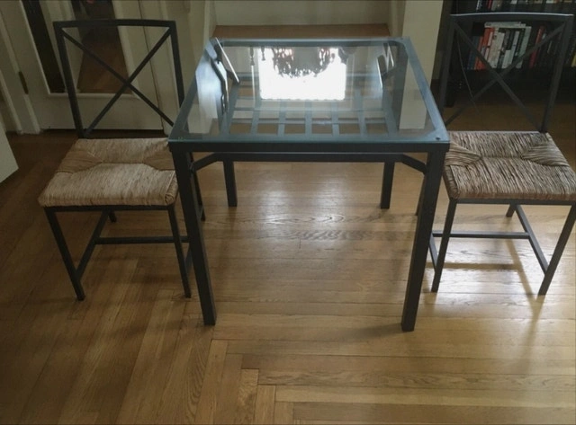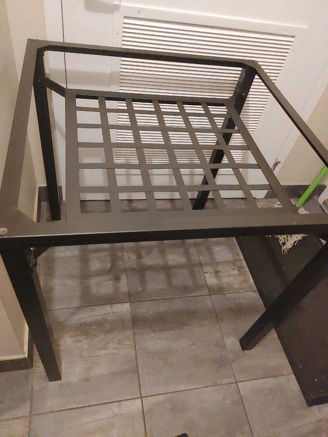 Tempered glass-top table with a black metal frame. Asking $90 or best offer. Price recently reduced as of October 5, 2025. The table has been disassembled to free up space. To reassemble it, you'll need an Allen key, but it's straightforward and takes about 15 minutes. All nuts and bolts are included. It's in very good condition with an open grid shelf beneath the glass. There may be a few light scratches on the glass, but they are hardly noticeable. Text or call 343-999-5770 for measurements. Decorations in photos are not for sale.