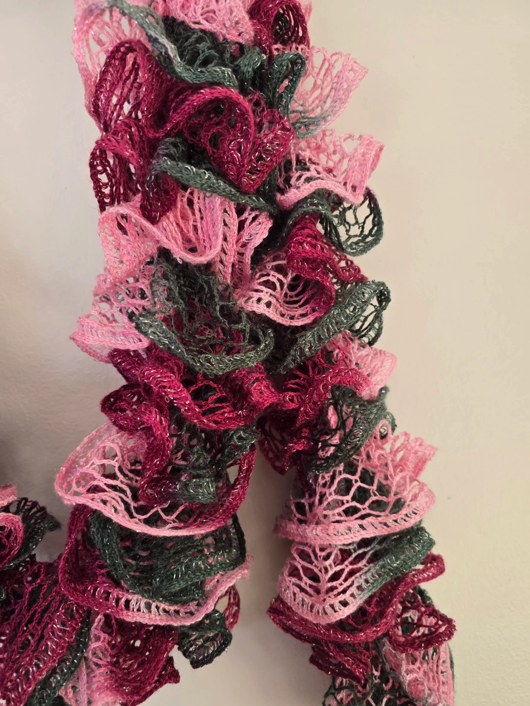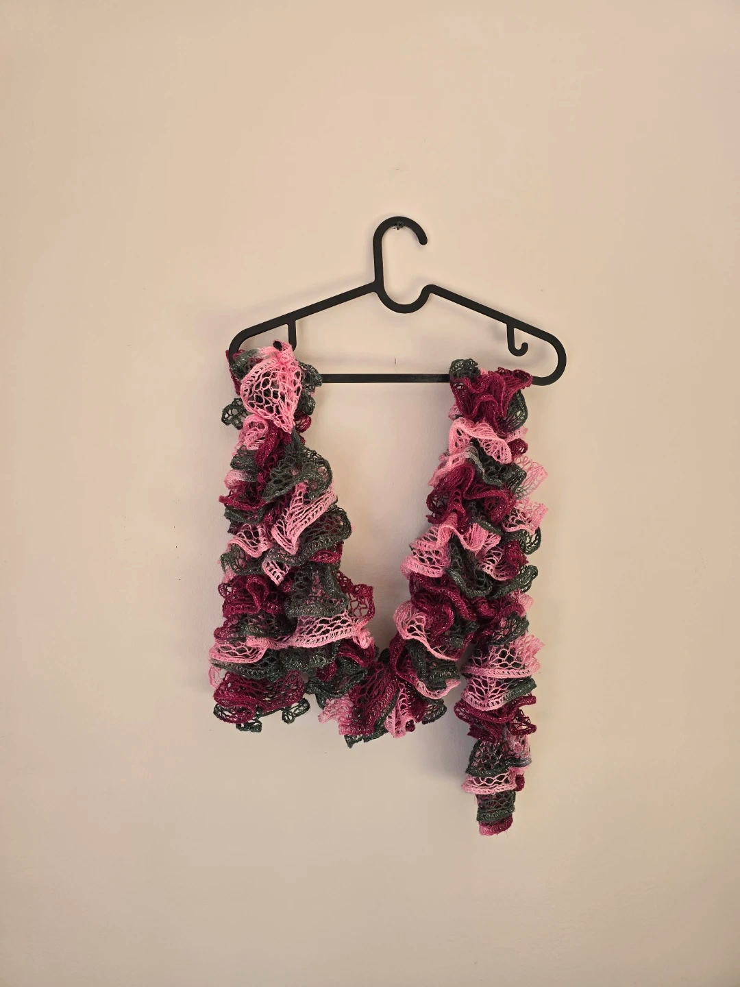 A pretty ruffled scarf in a mix of pink, grey, and burgundy tones! 🧣 It's a fun and unique accessory to add some texture to your outfit ✨ #scarf #ruffles #pink #grey #burgundy #accessory #texture #outfit