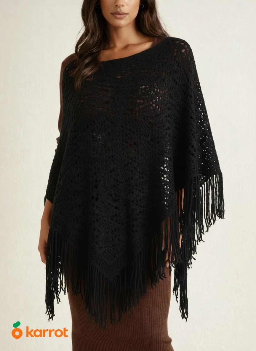 Here's a stylish black crochet poncho with fringe! 🖤✨ It's in great condition and would be a lovely addition to your wardrobe. The open knit design makes it breathable and perfect for layering. 🌬️🧣 #poncho #crochet #fringe #fashion #wardrobe #style #knit #design #layering #naturalwool