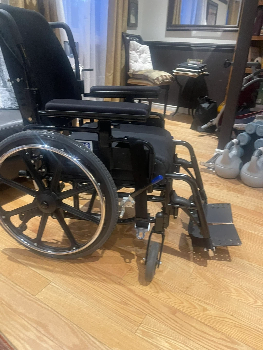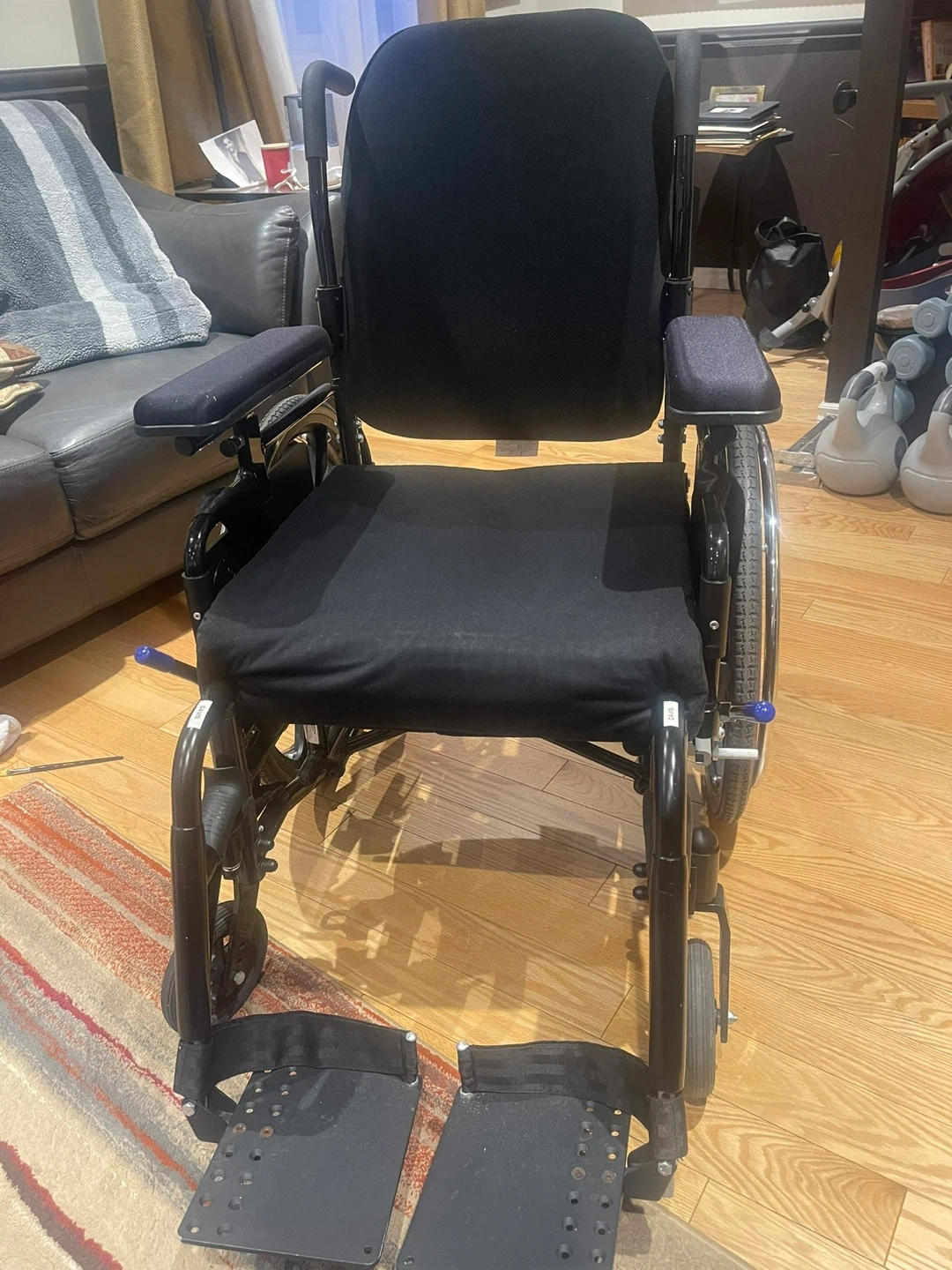 Selling a black wheelchair in great condition. It's perfect for anyone needing mobility assistance. It is lightweight and portable
