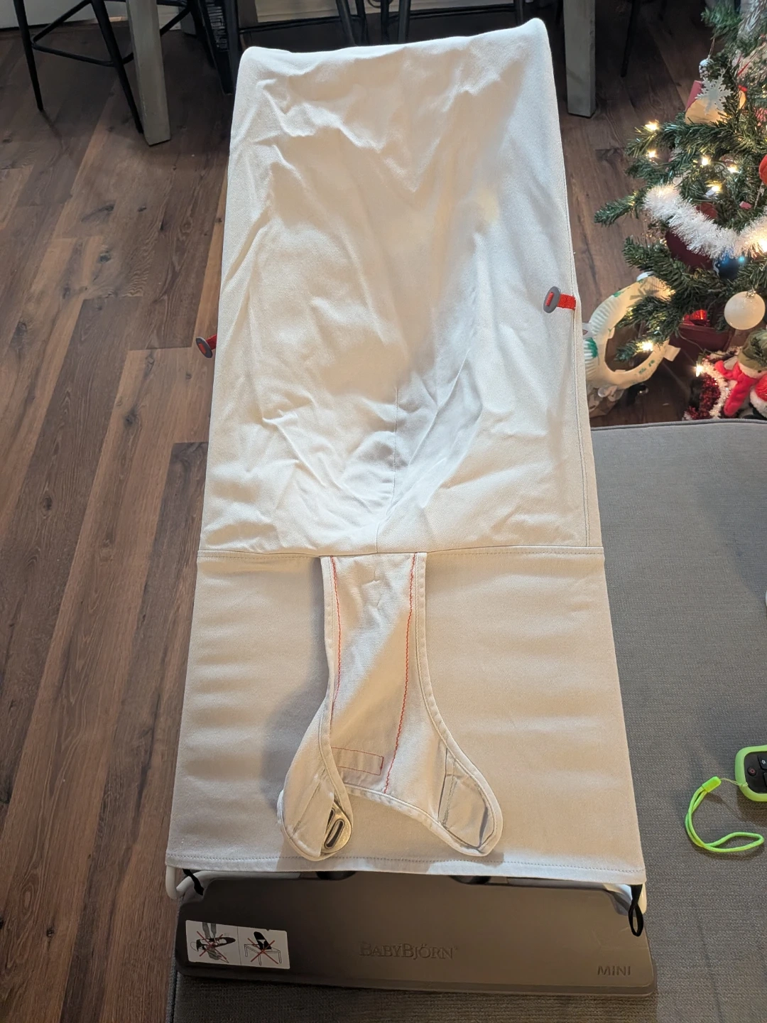 Light grey cover, freshly washed and ready to use.Simple, gentle bounce when baby moves; no batteries needed.
