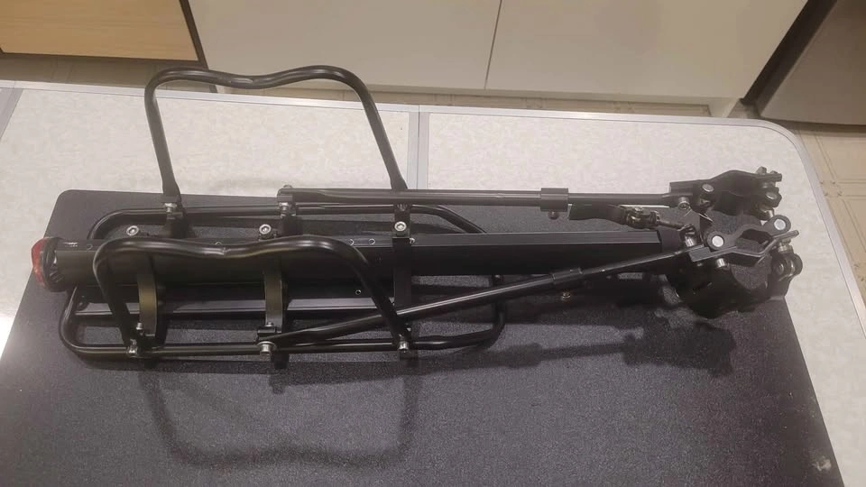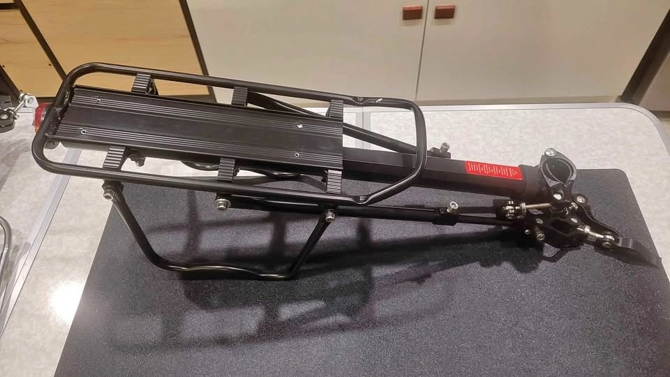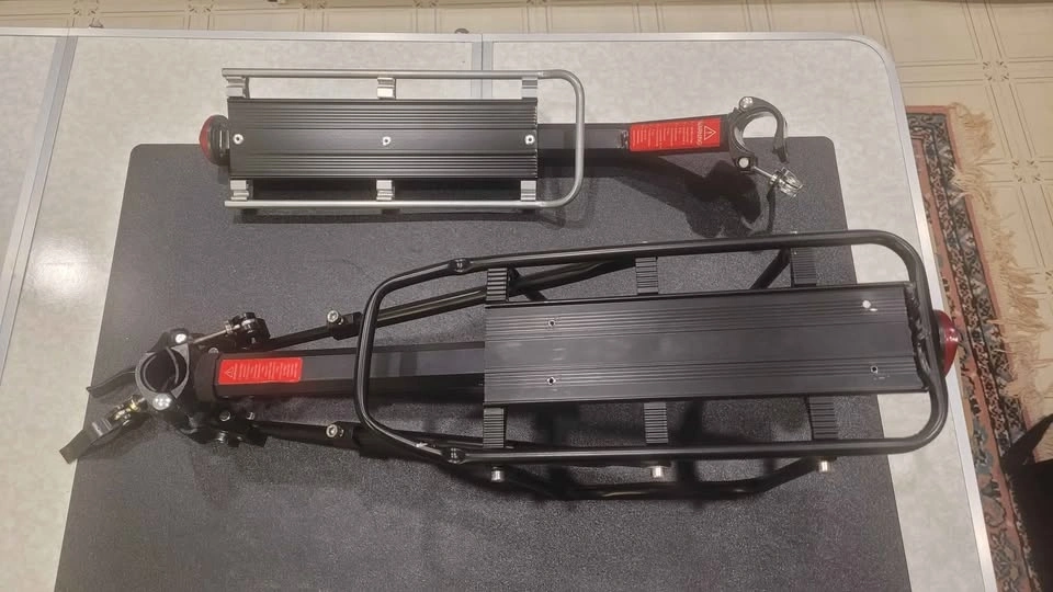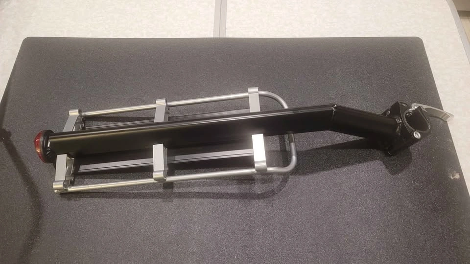 Seatpost and rear frame mount quick release style rack mount. Slight bent in flat area due to shipping. $45