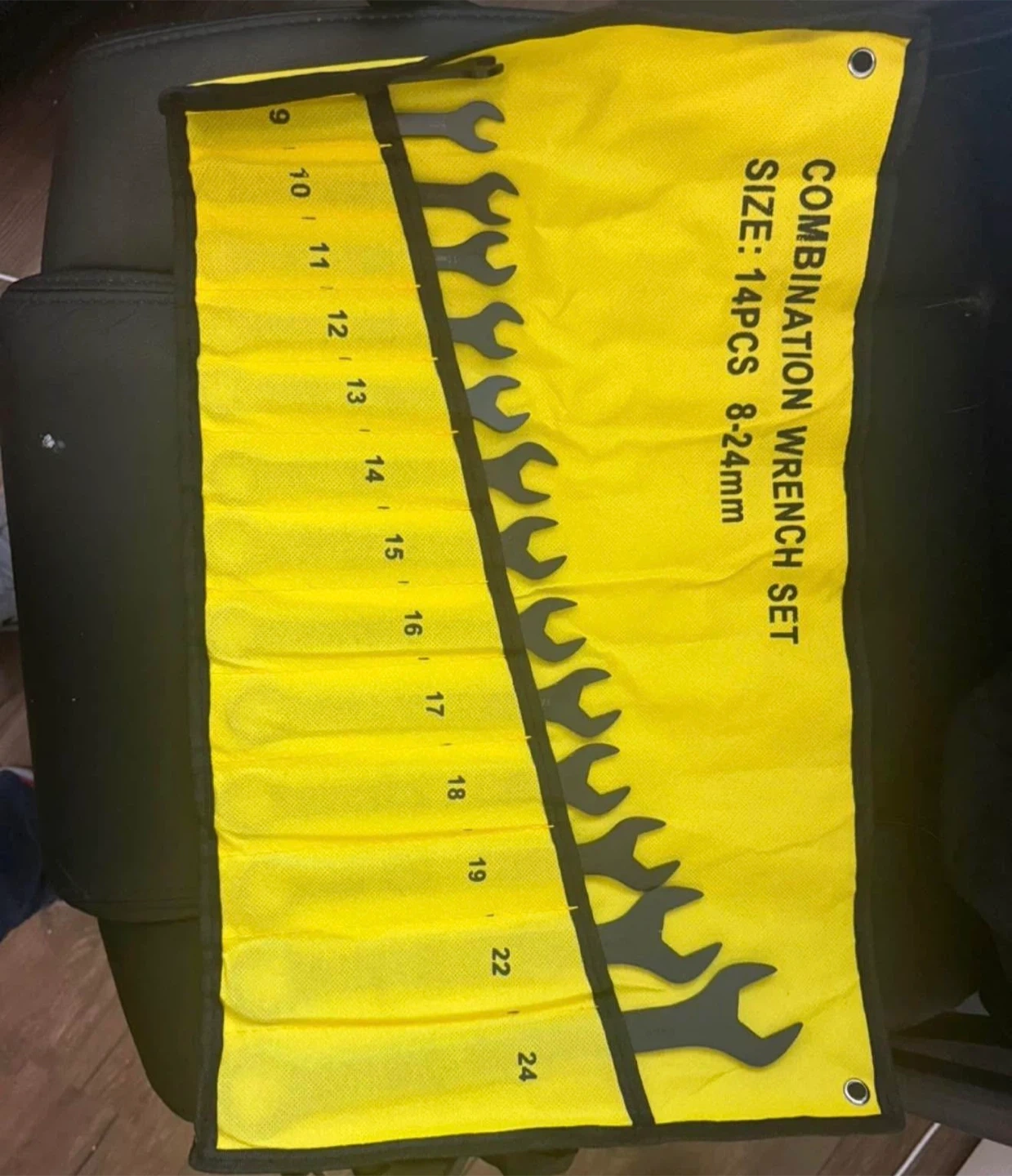 Selling a combination wrench set, which includes 14 pieces ranging from 8-24mm. It comes in a convenient yellow and black roll-up pouch for easy storage and organization. Perfect for any DIY project or professional use!