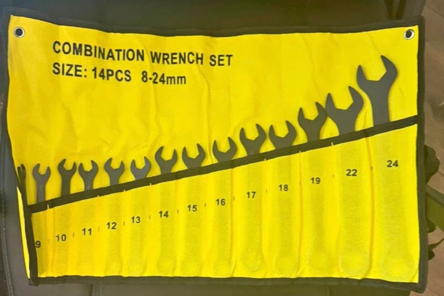 Selling a combination wrench set, which includes 14 pieces ranging from 8-24mm. It comes in a convenient yellow and black roll-up pouch for easy storage and organization. Perfect for any DIY project or professional use!