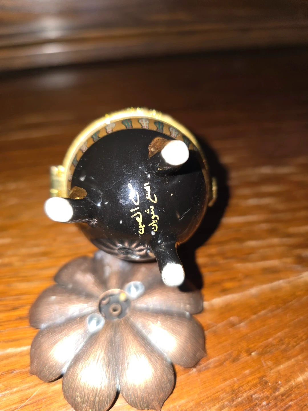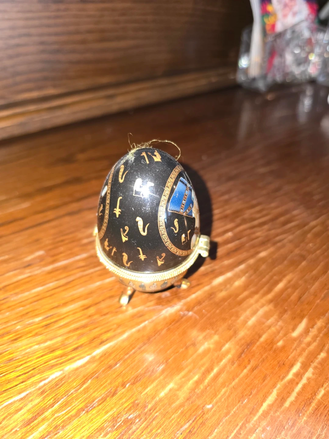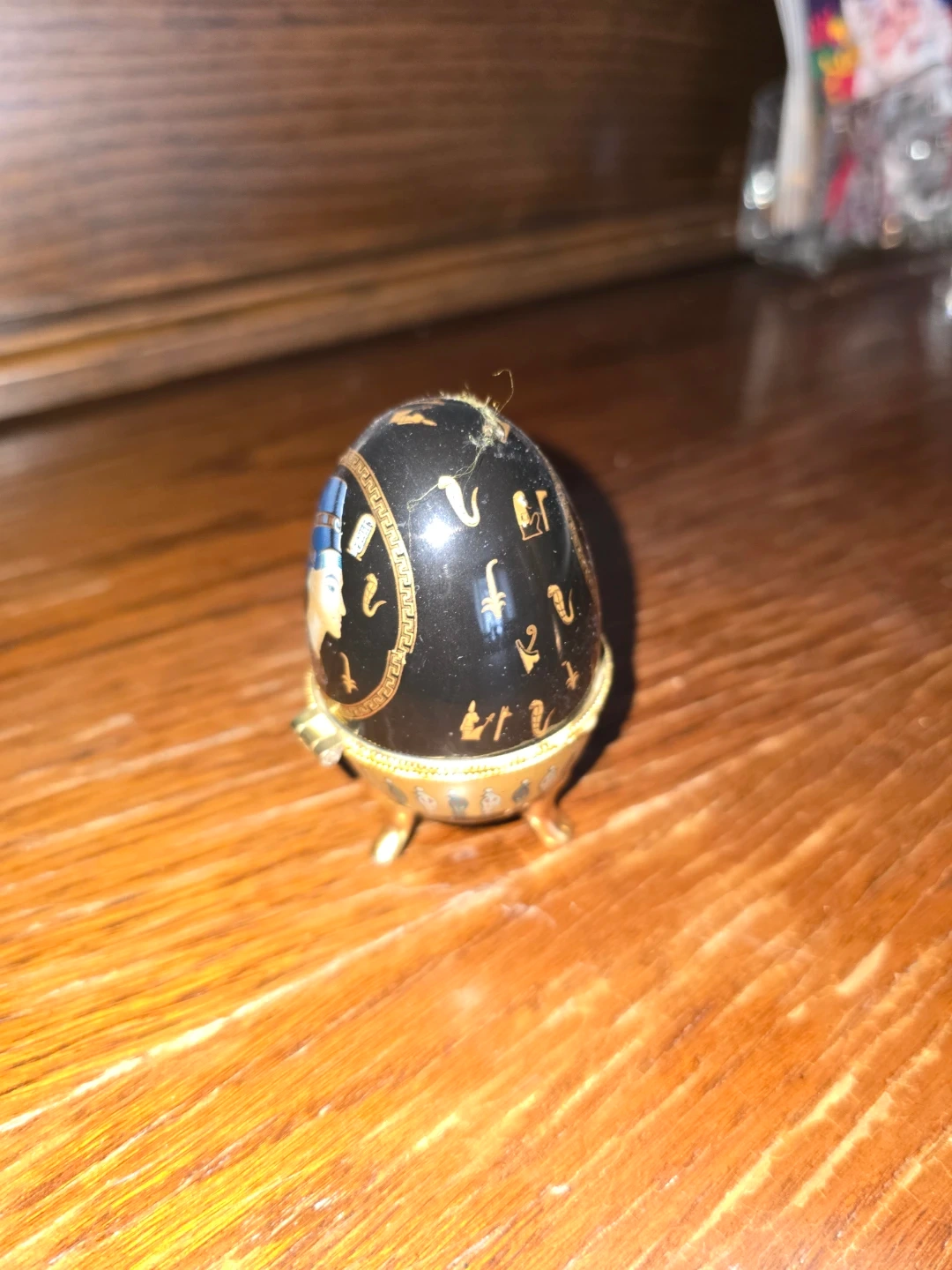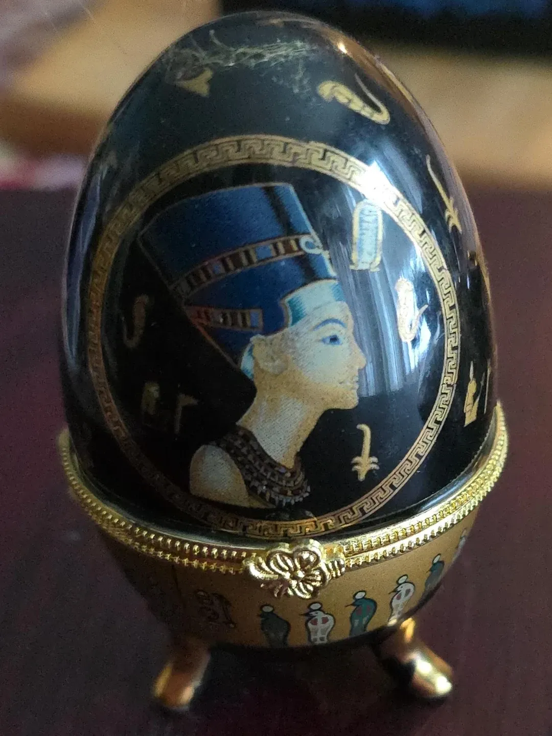 Here's a unique Egyptian-themed egg trinket box! It features a portrait of Nefertiti and other Egyptian symbols on a black egg shape, with gold accents. It opens up to reveal a small storage space inside. Perfect for holding small treasures or as a decorative piece!