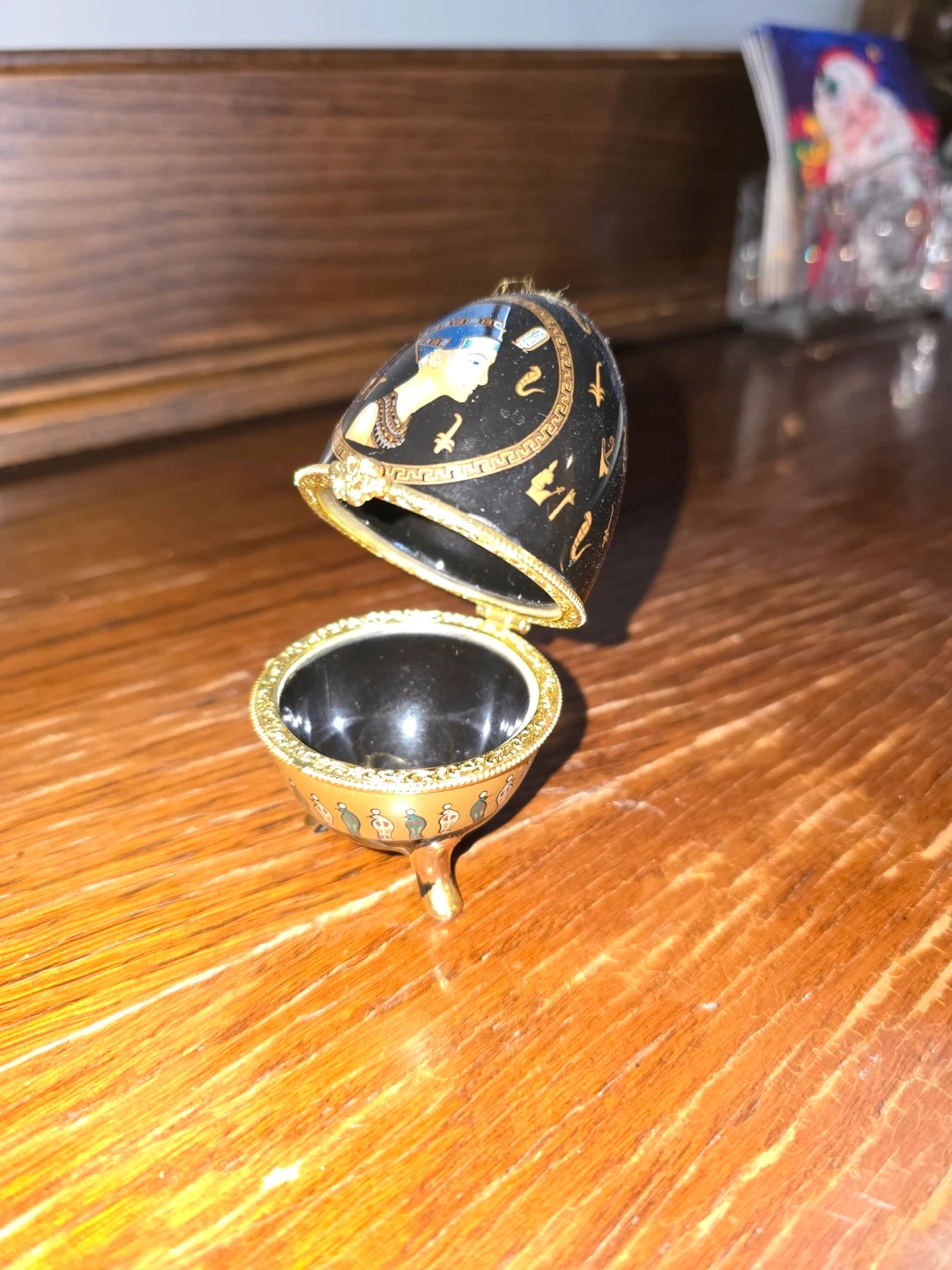 Here's a unique Egyptian-themed egg trinket box! It features a portrait of Nefertiti and other Egyptian symbols on a black egg shape, with gold accents. It opens up to reveal a small storage space inside. Perfect for holding small treasures or as a decorative piece!