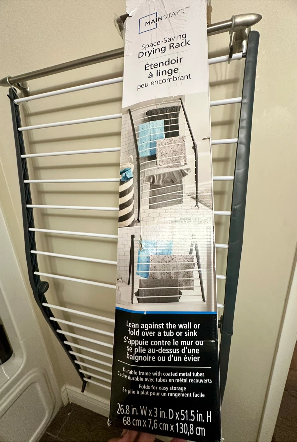 Selling a New open box Mainstays space-saving drying rack in excellent condition! It's perfect for small spaces and can lean against the wall or fold over a tub or sink.