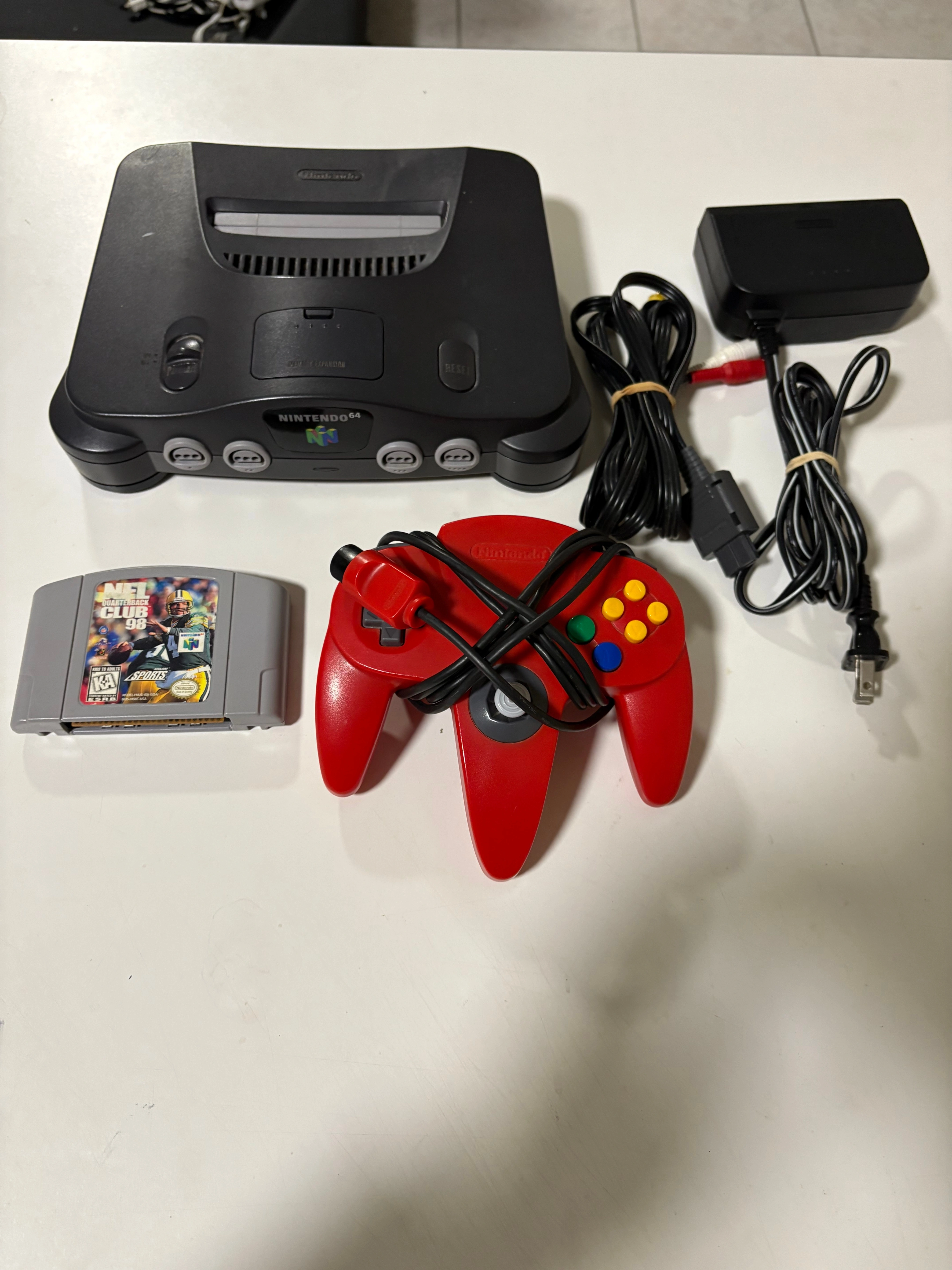 Black N64 with original power and AV cords. Comes with red controller and NFL Quarterback Club 98. Check out my other ads. Open to trades.