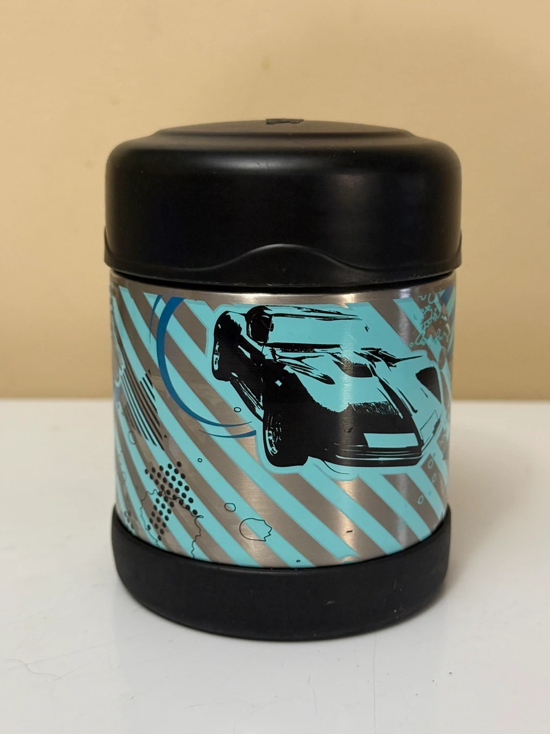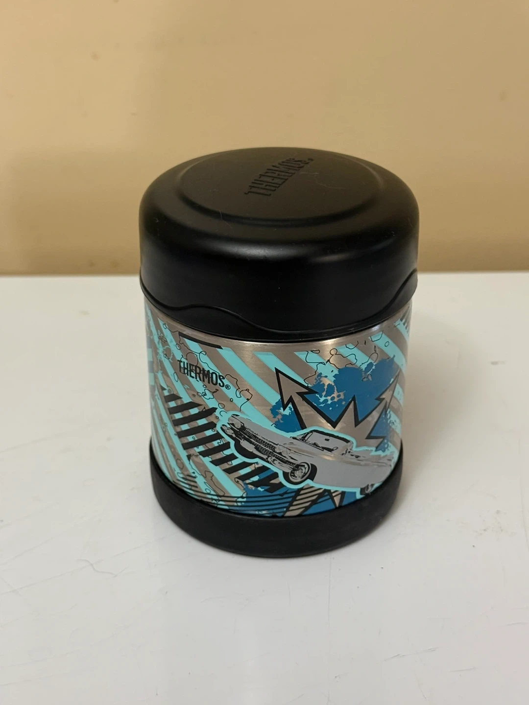 This is a used Thermos food container featuring a sleek black and aqua design with a car graphic. It's perfect for keeping your meals hot or cold on the go. The condition is used. It holds approximately 300ml, is made of stainless steel, and has a wide mouth for easy filling and cleaning.