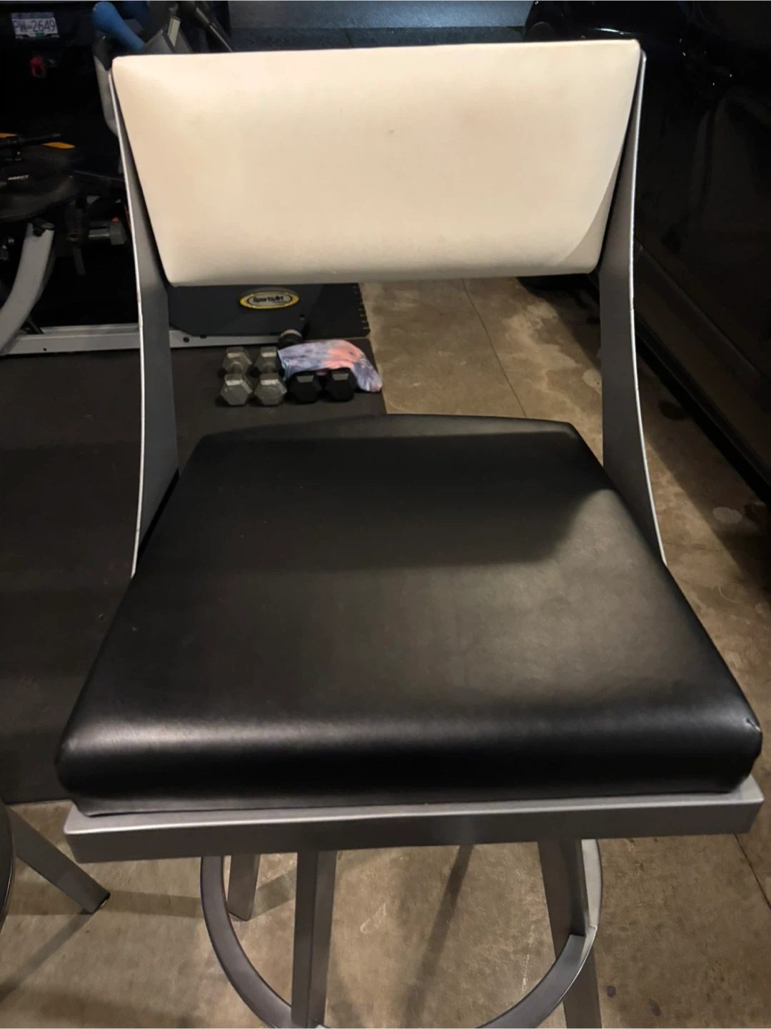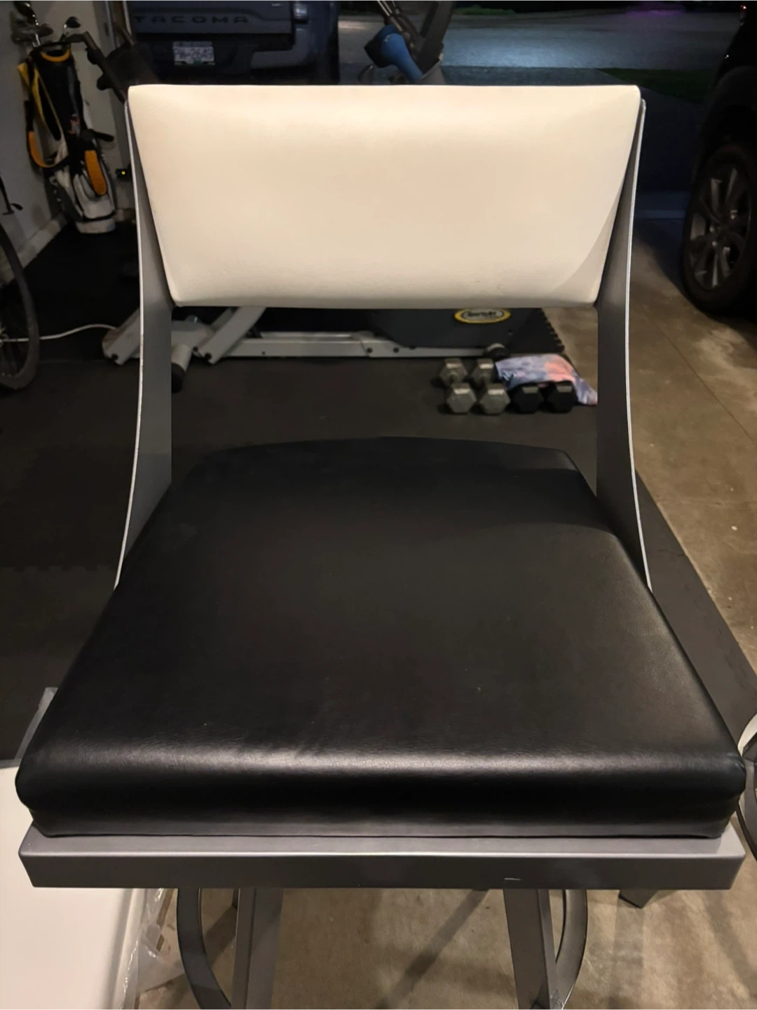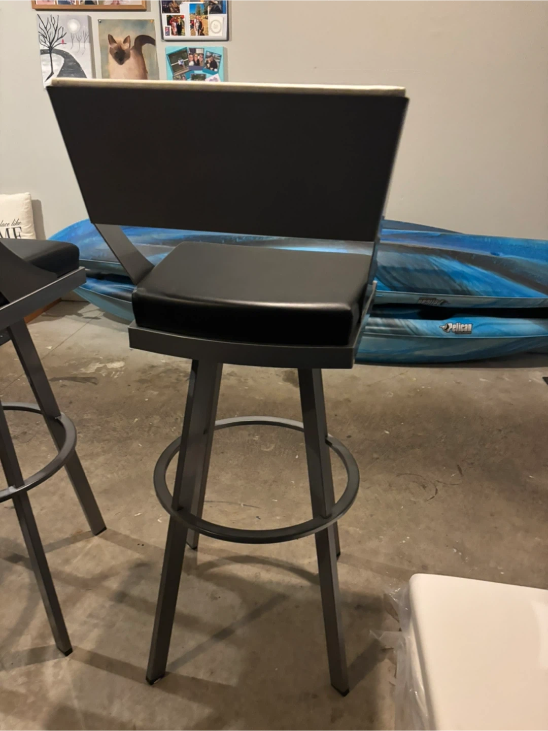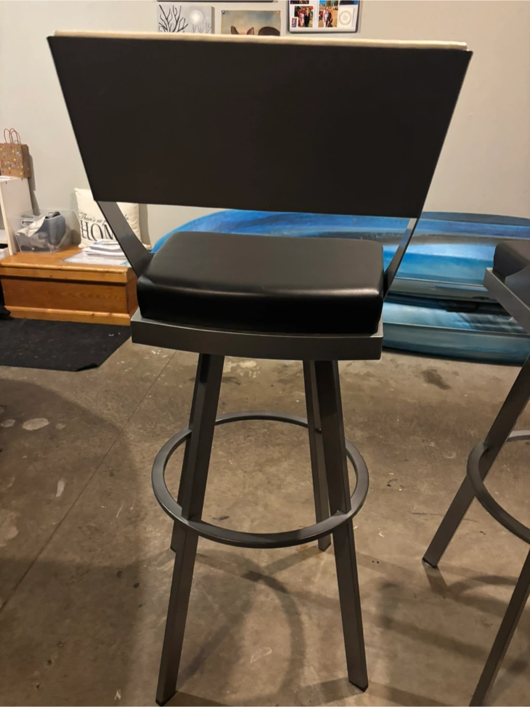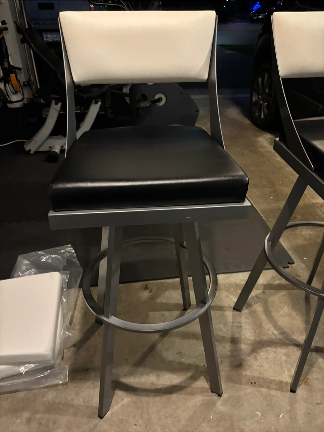 Selling a set of two bar stools! They feature a sleek black seat and a white backrest. Perfect for adding a modern touch to your kitchen or bar area