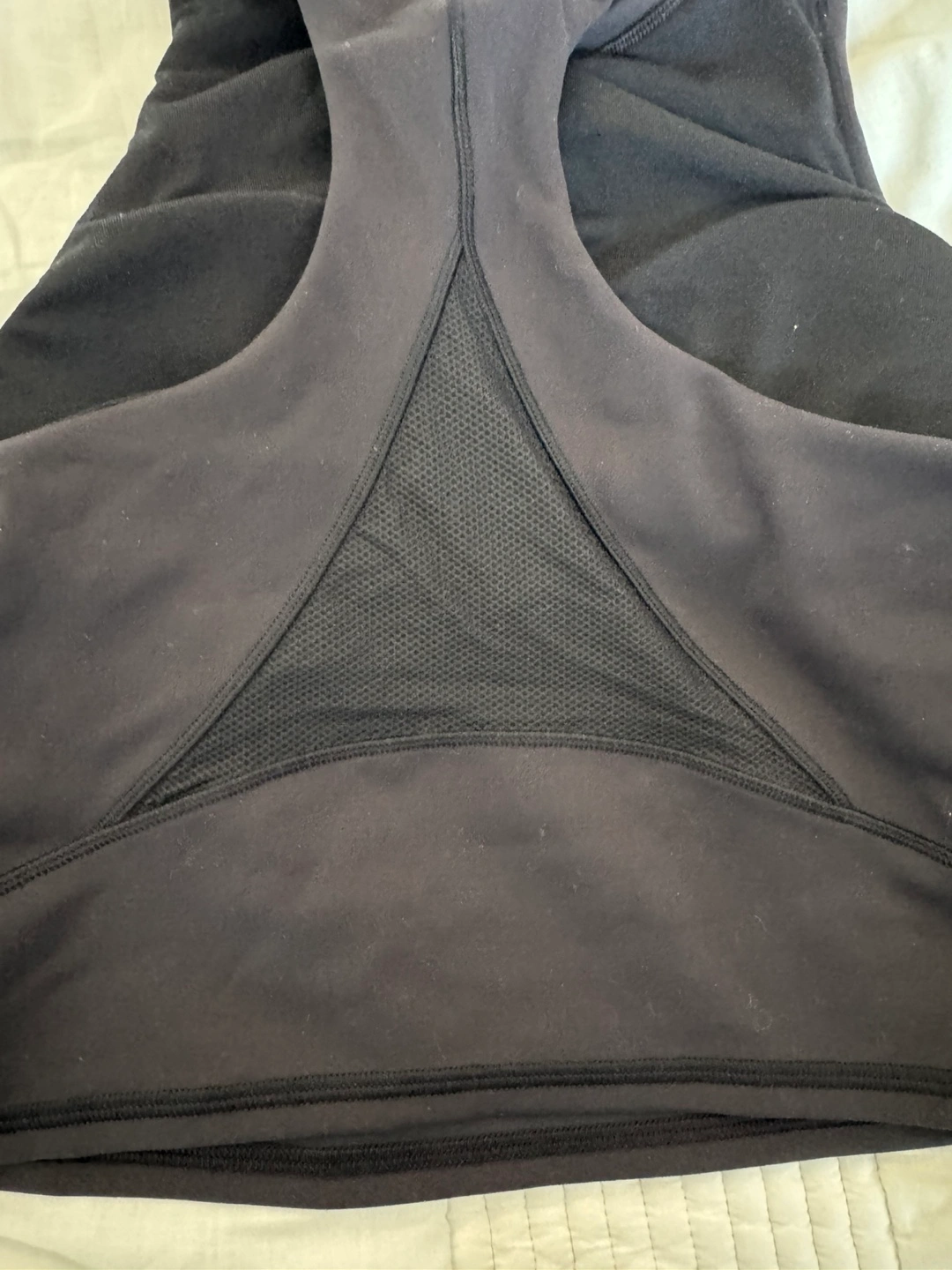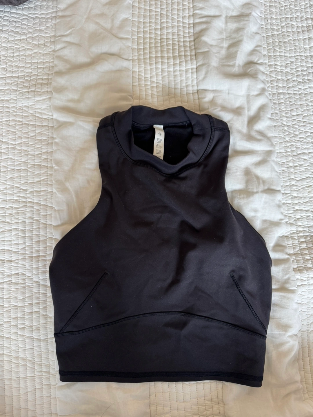 Selling a Lululemon workout top in black, size 6. The body is made of 77% nylon and 23% lycra elastane. The bra lining is 56% coolmax polyester and 44% lycra elastane. Cup lining is 81% nylon and 19% elastane. Wing lining is 100% nylon