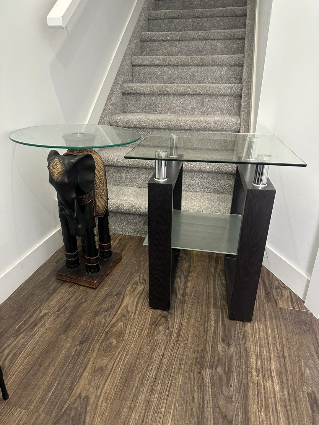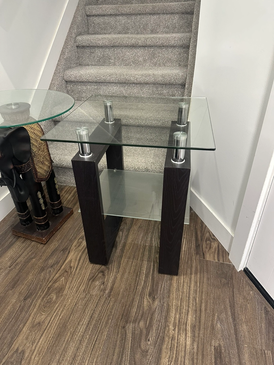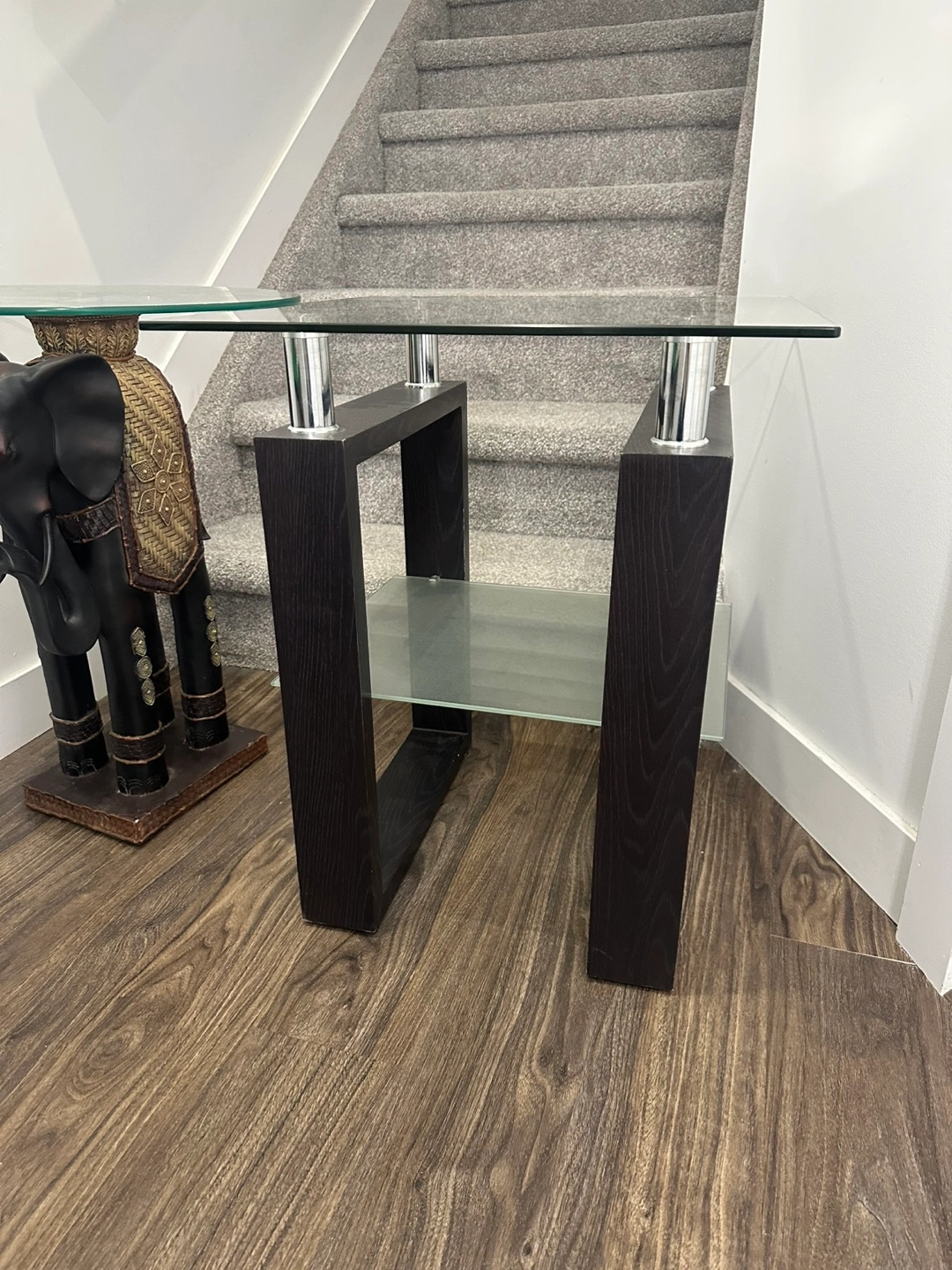Selling a glass top end table with a brown wood base. It's in good condition and would look great in an entryway or living room.