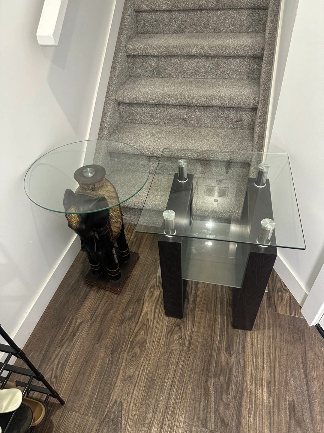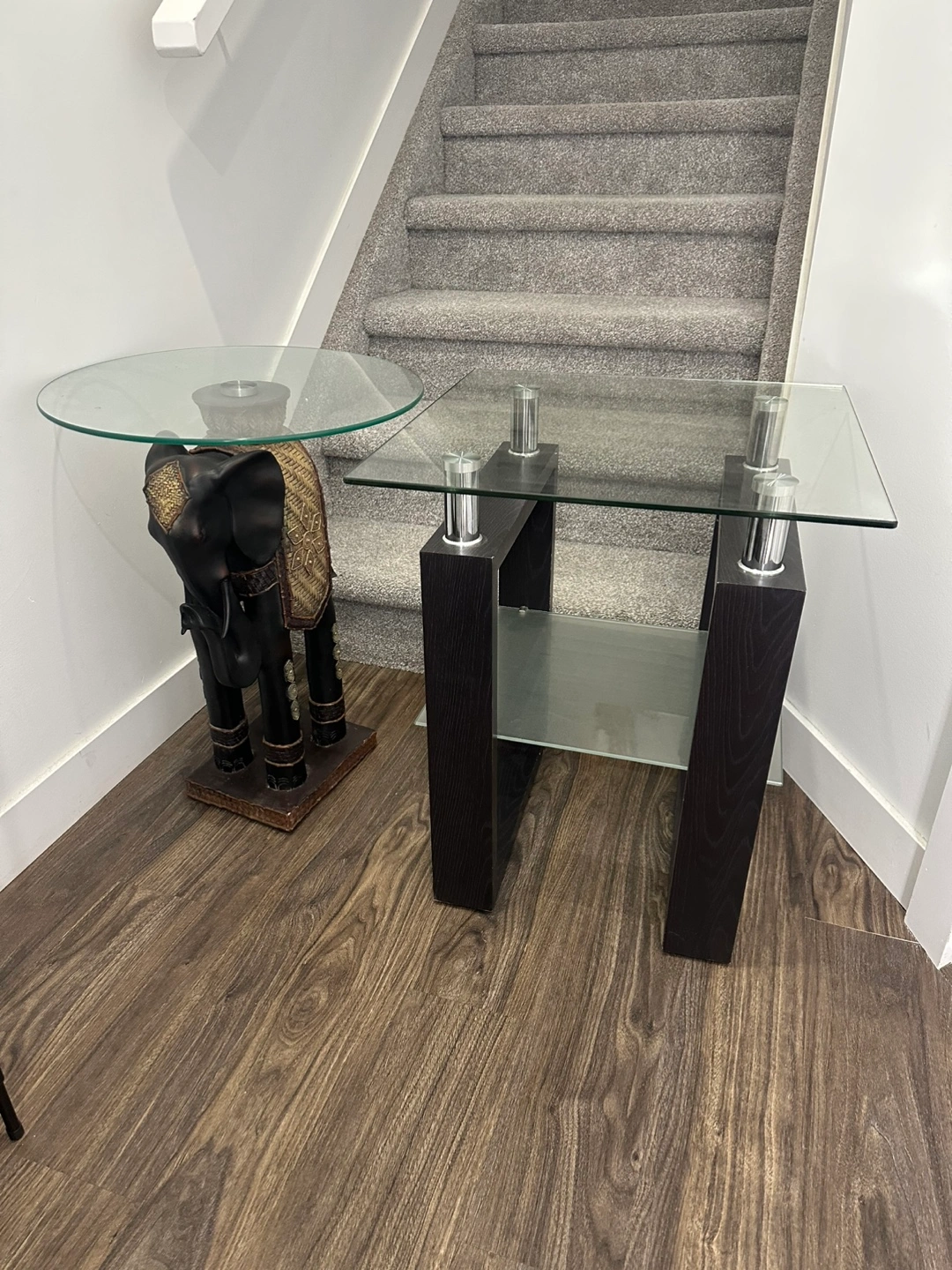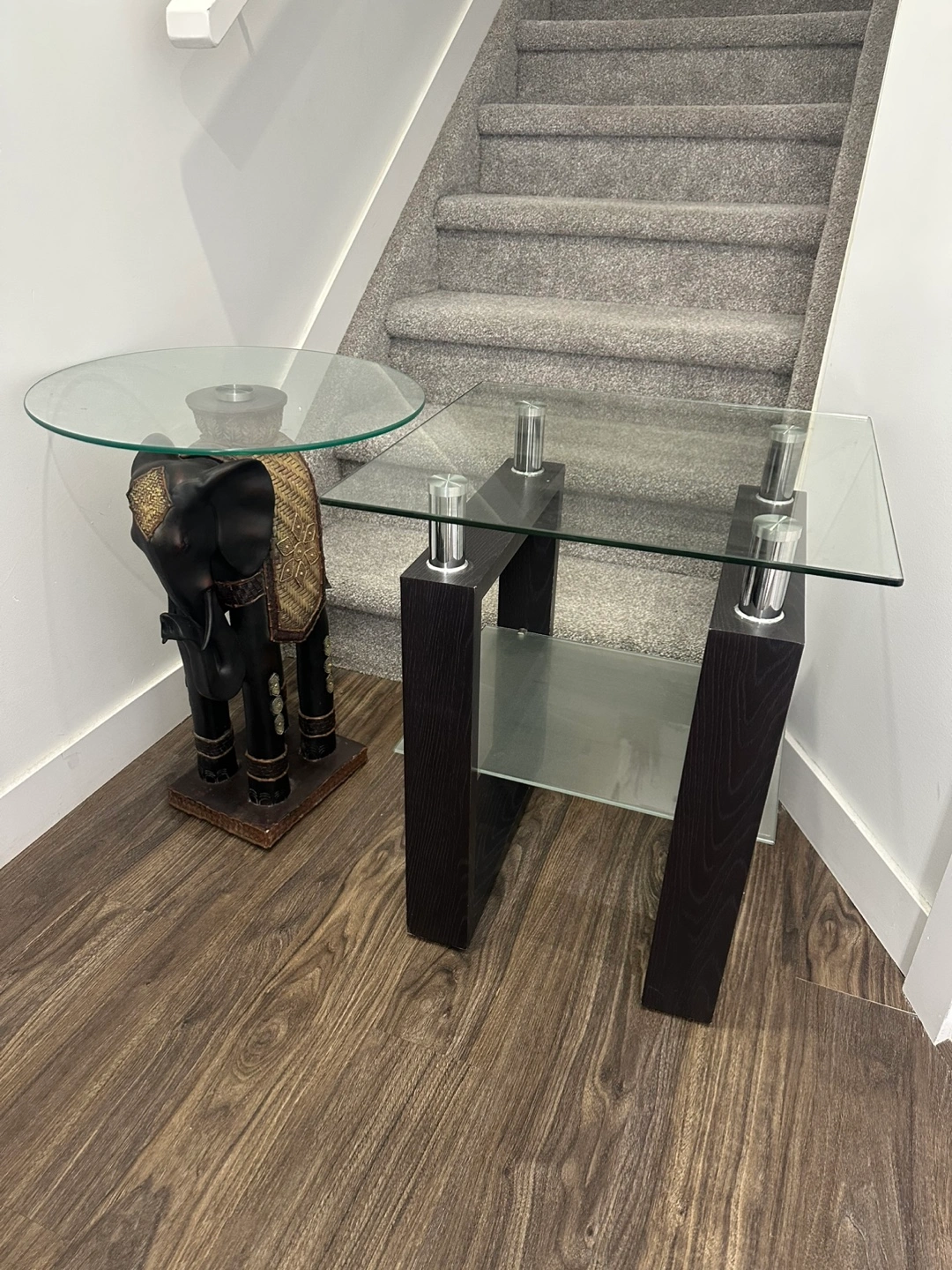 Selling a glass top end table with a brown wood base. It's in good condition and would look great in an entryway or living room.