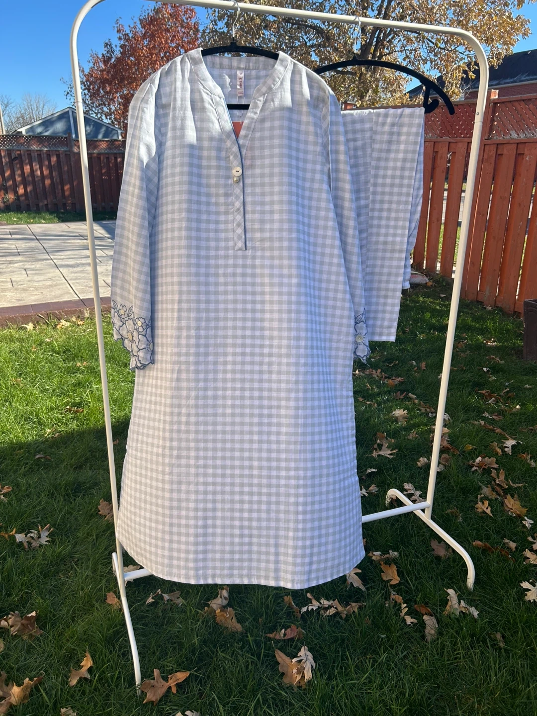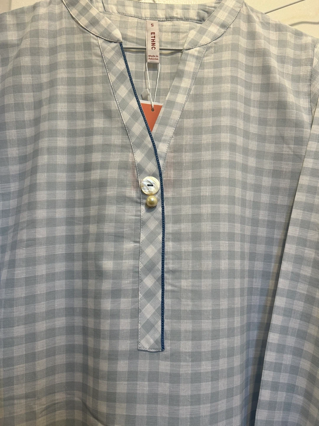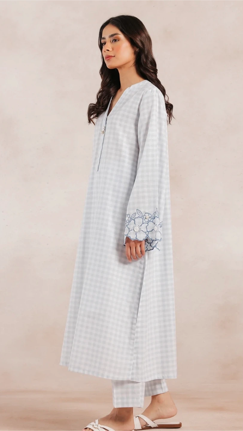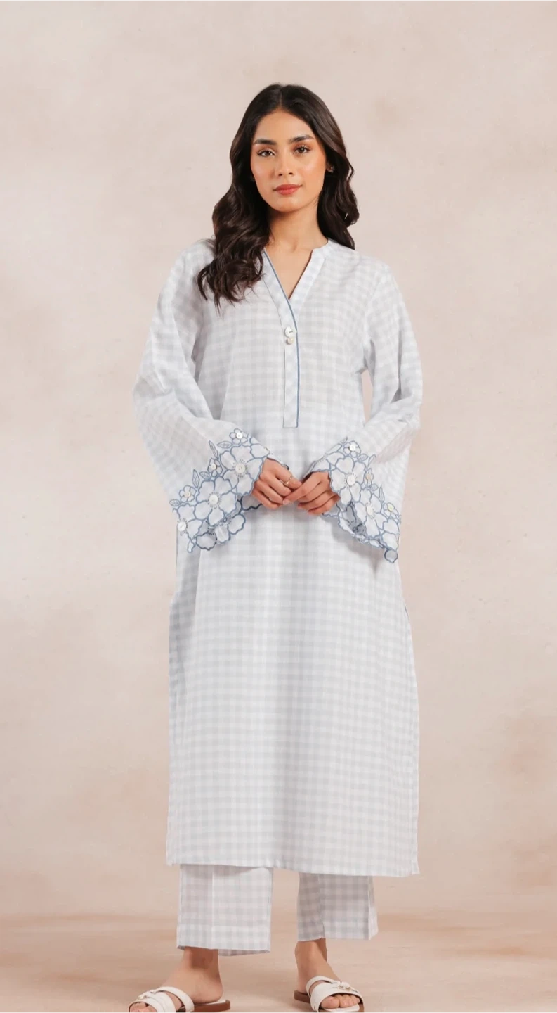 This is a beautiful Ethnic by Outfitters. It's size small and Medium 2 pcs dress features a lovely light blue and white checkered pattern with floral embroidery on the sleeves. Perfect for adding a touch of elegance to your wardrobe!