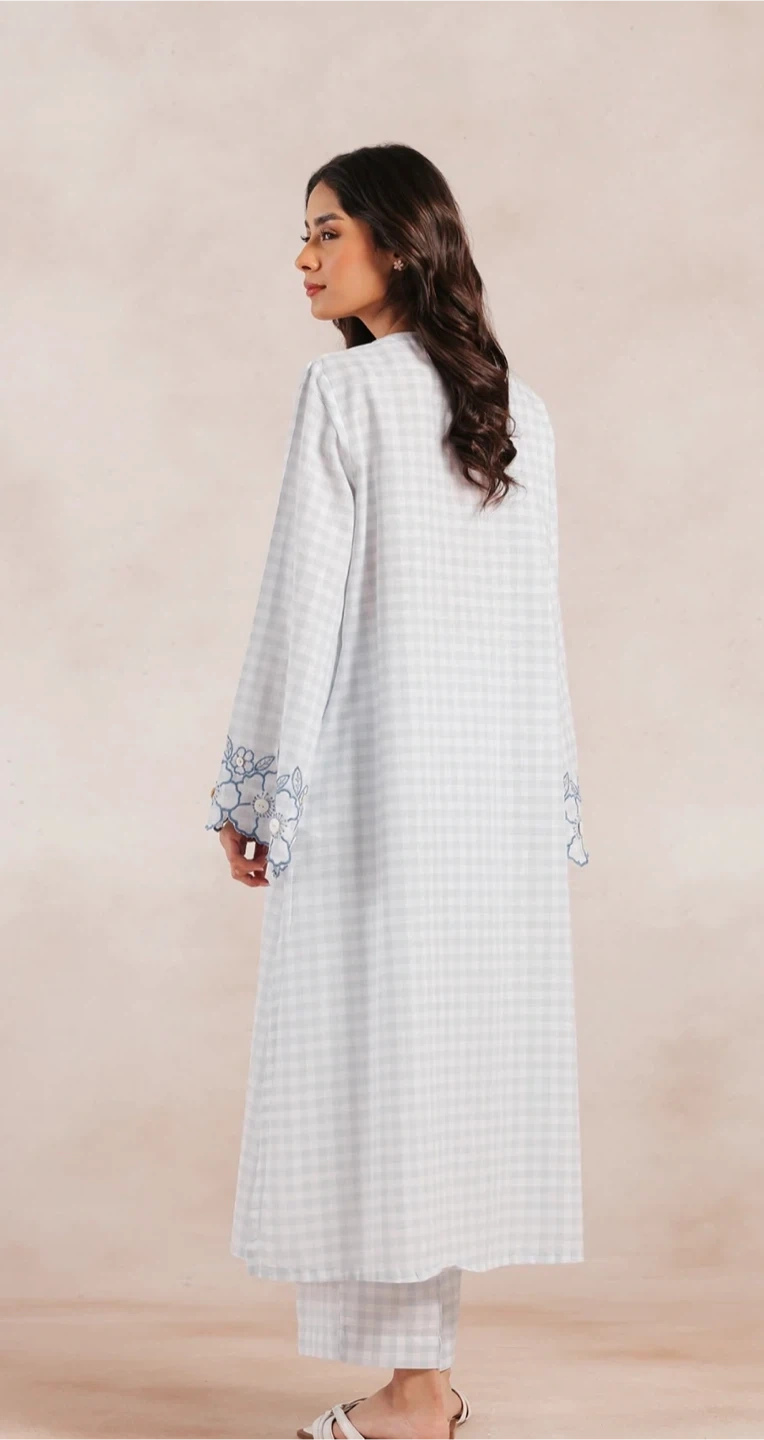 This is a beautiful Ethnic by Outfitters. It's size small and Medium 2 pcs dress features a lovely light blue and white checkered pattern with floral embroidery on the sleeves. Perfect for adding a touch of elegance to your wardrobe!