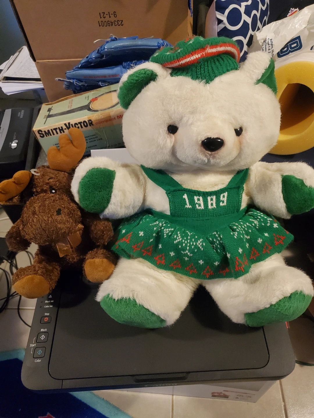 Selling a vintage Aurora plush bear from 1989! It's in great shape and has a cute green dress with a festive pattern. A charming addition to any collection or a cuddly friend for someone special. Also brown moose - $ 20.00 for bear , $ 5.00 for moose - pick up Main and Danforth