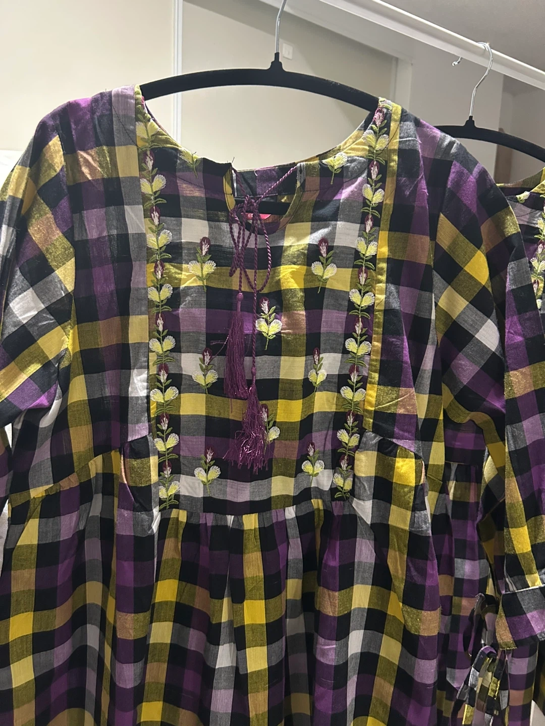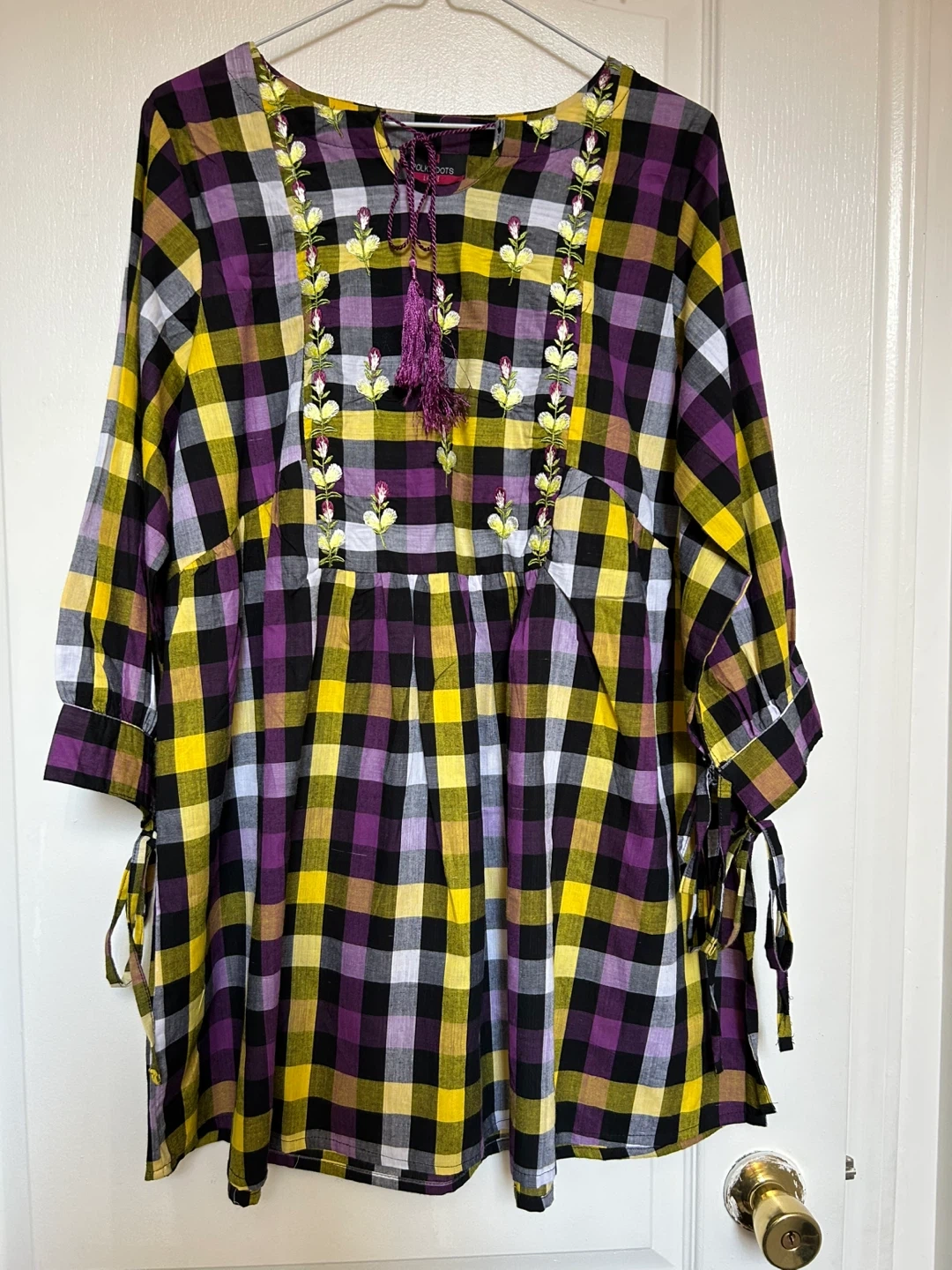 A vibrant plaid pattern tunic with floral embroidery. It's a size small and large features a comfortable, relaxed fit. Perfect for adding a pop of colour to your wardrobe!