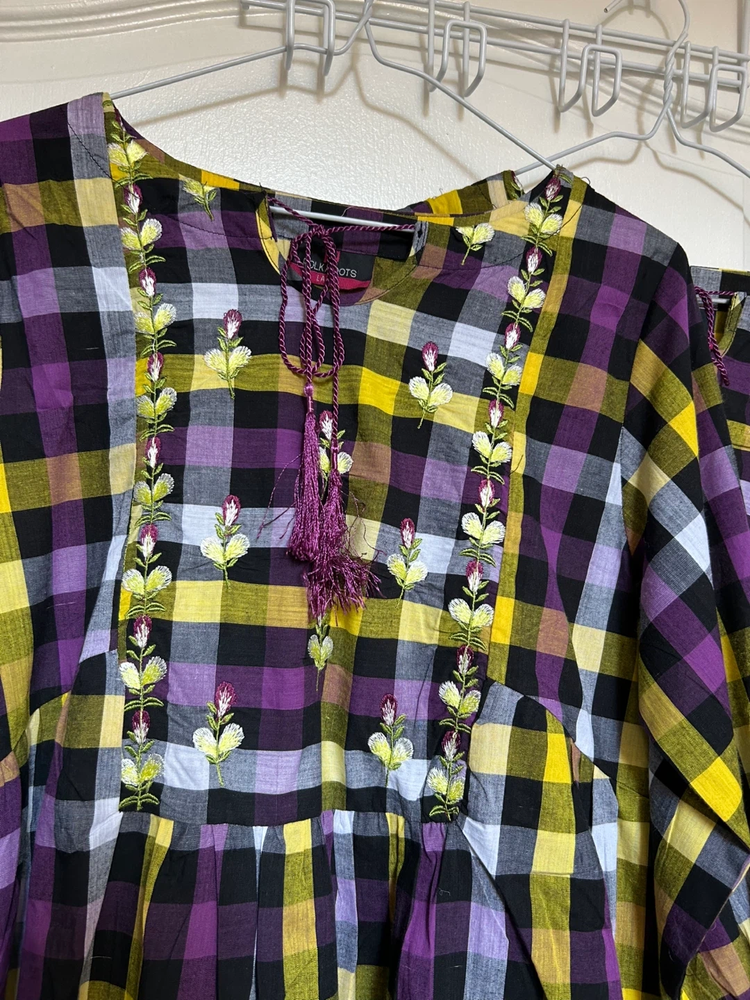 A vibrant plaid pattern tunic with floral embroidery. It's a size small and large features a comfortable, relaxed fit. Perfect for adding a pop of colour to your wardrobe!
