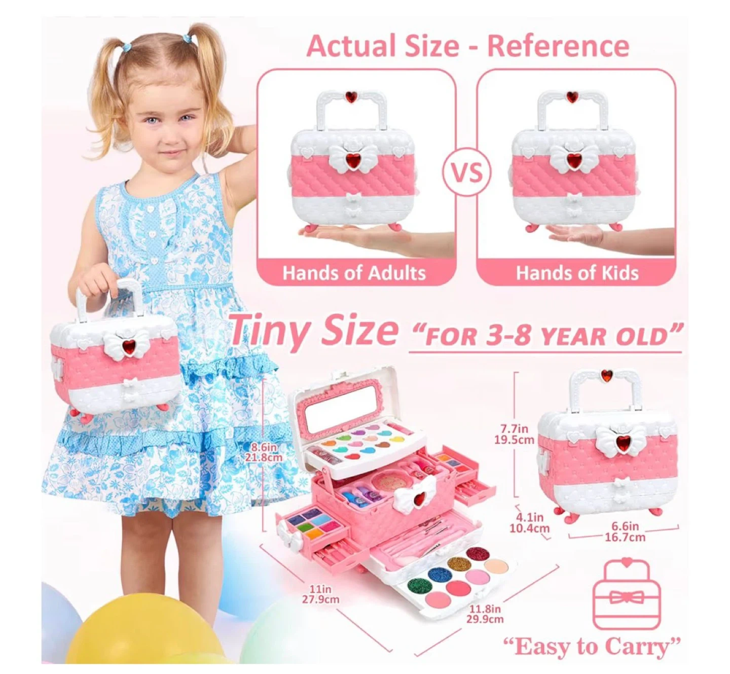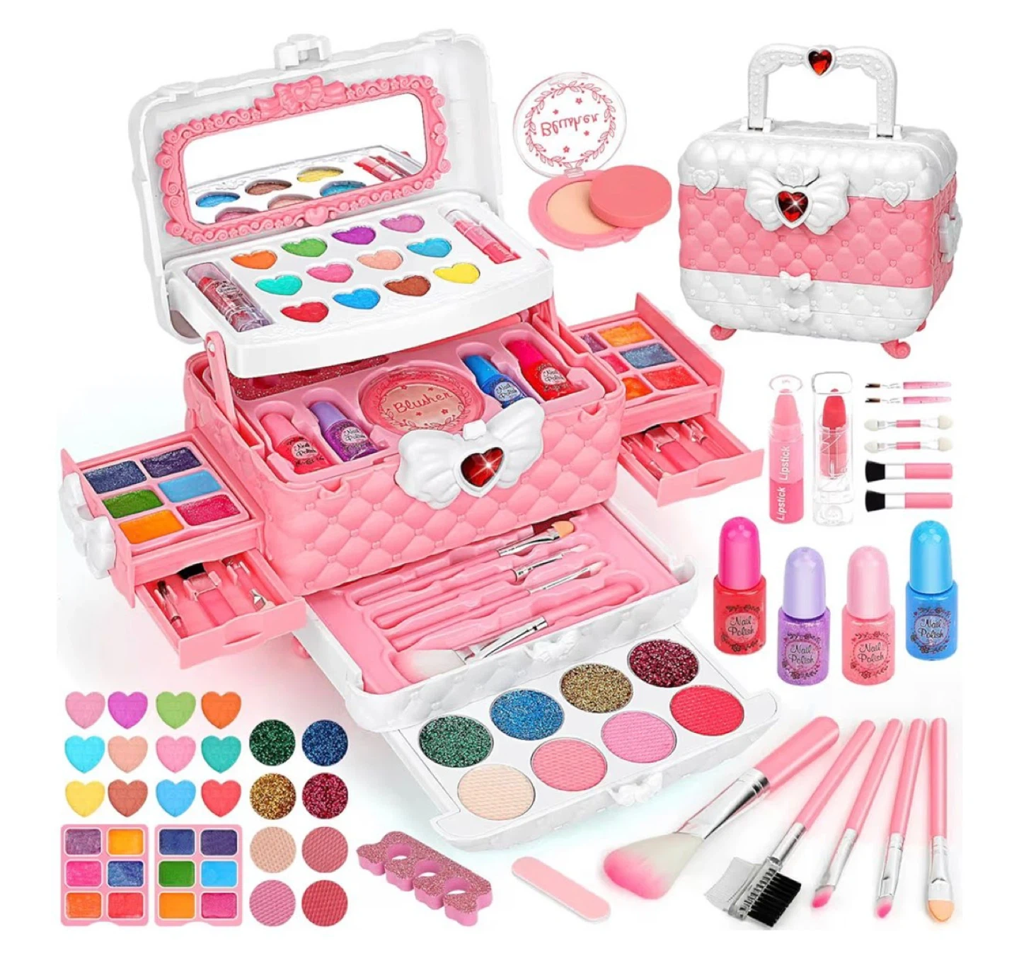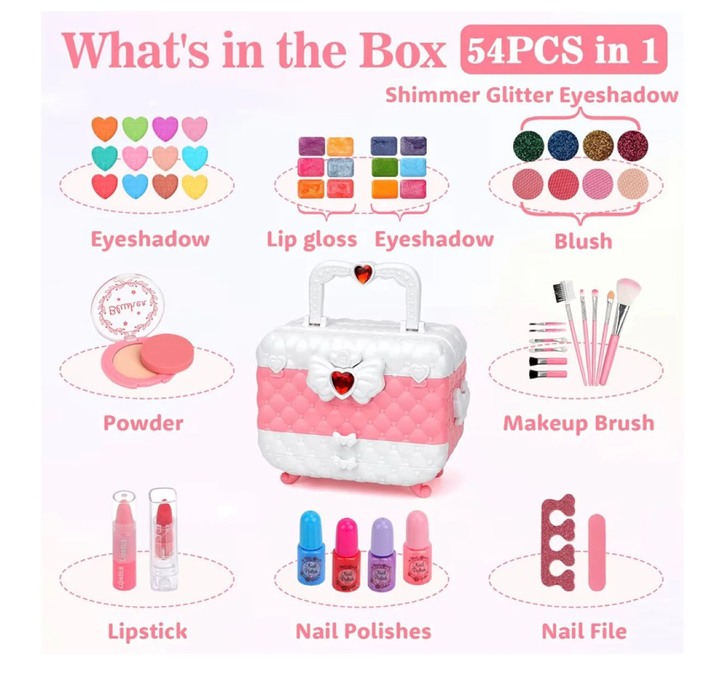 This cute little makeup kit is perfect for kids aged 3-8! It comes with 54 pieces, including eyeshadow, lip gloss, blush, powder, lipstick, nail polishes, makeup brushes, and a nail file. It's easy to carry, so your little one can take it anywhere