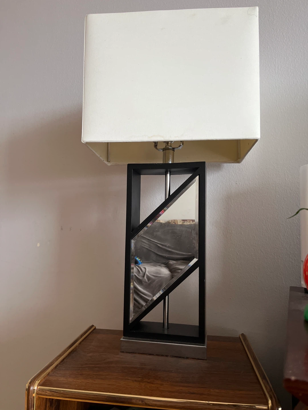 Selling a modern table lamp with a black frame and a white lampshade. It's in great condition and would look lovely in any room!