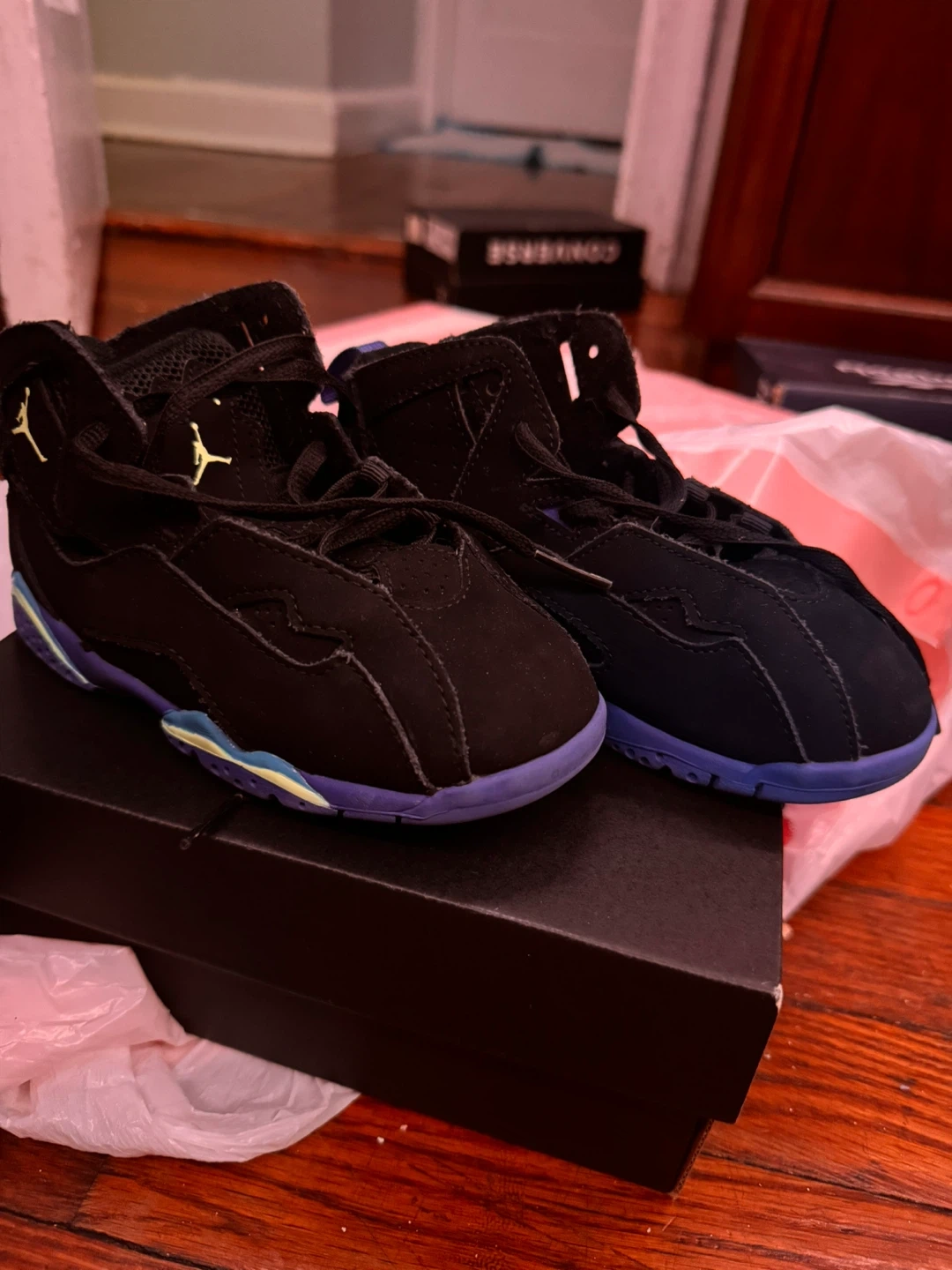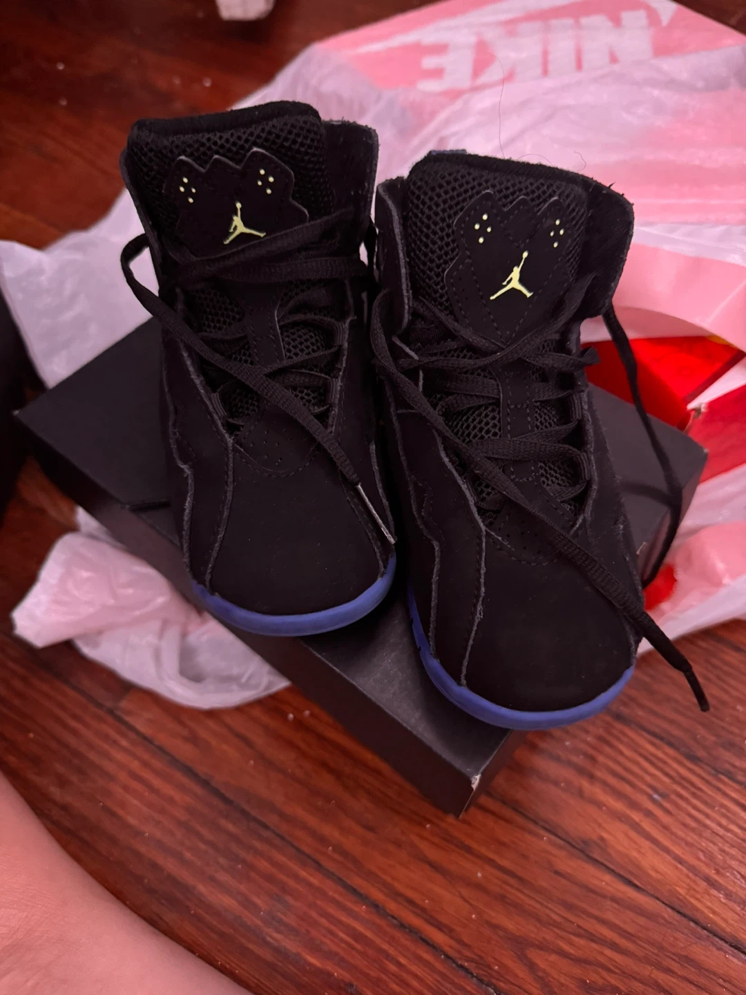 Selling a pair of Nike Air Jordan 7 Retro toddler shoes in size 10c These black shoes have a stylish design and are in good condition. Perfect for your little one!