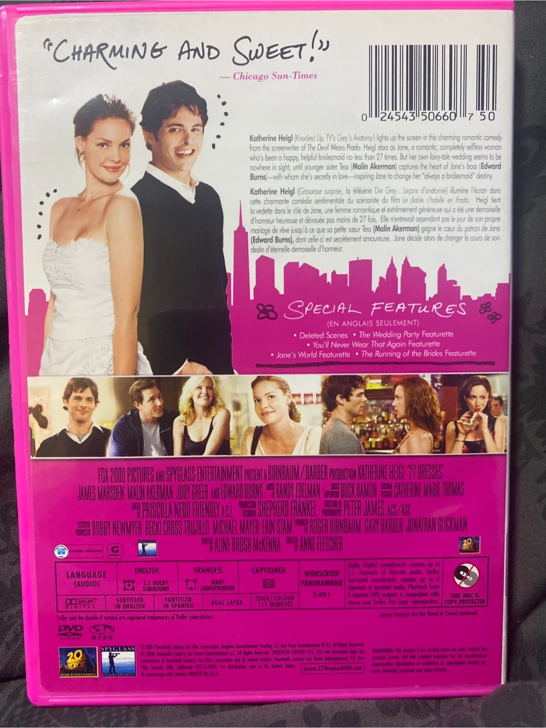 Selling the DVD of the movie '27 Dresses' starring Katherine Heigl! It's a charming and sweet romantic comedy. Special features include deleted scenes and featurettes like 'You'll Never Wear That Again' and 'The Running of the Brides'.