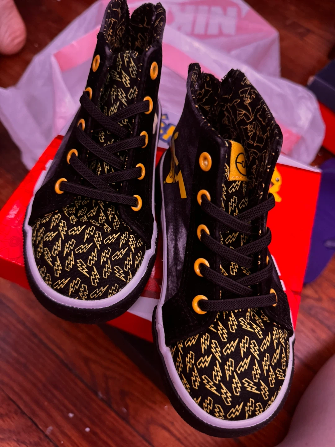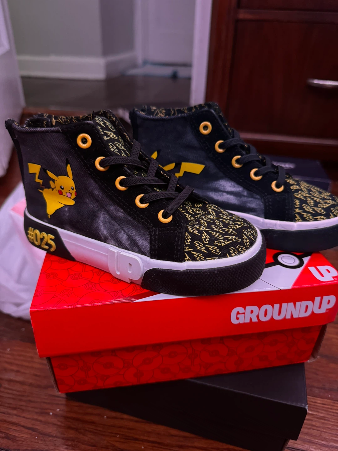These Ground Up high-top sneakers feature a fun Pikachu design! They have a black base with yellow lightning bolt patterns and Pikachu details. The shoes come with their original box. Size 10