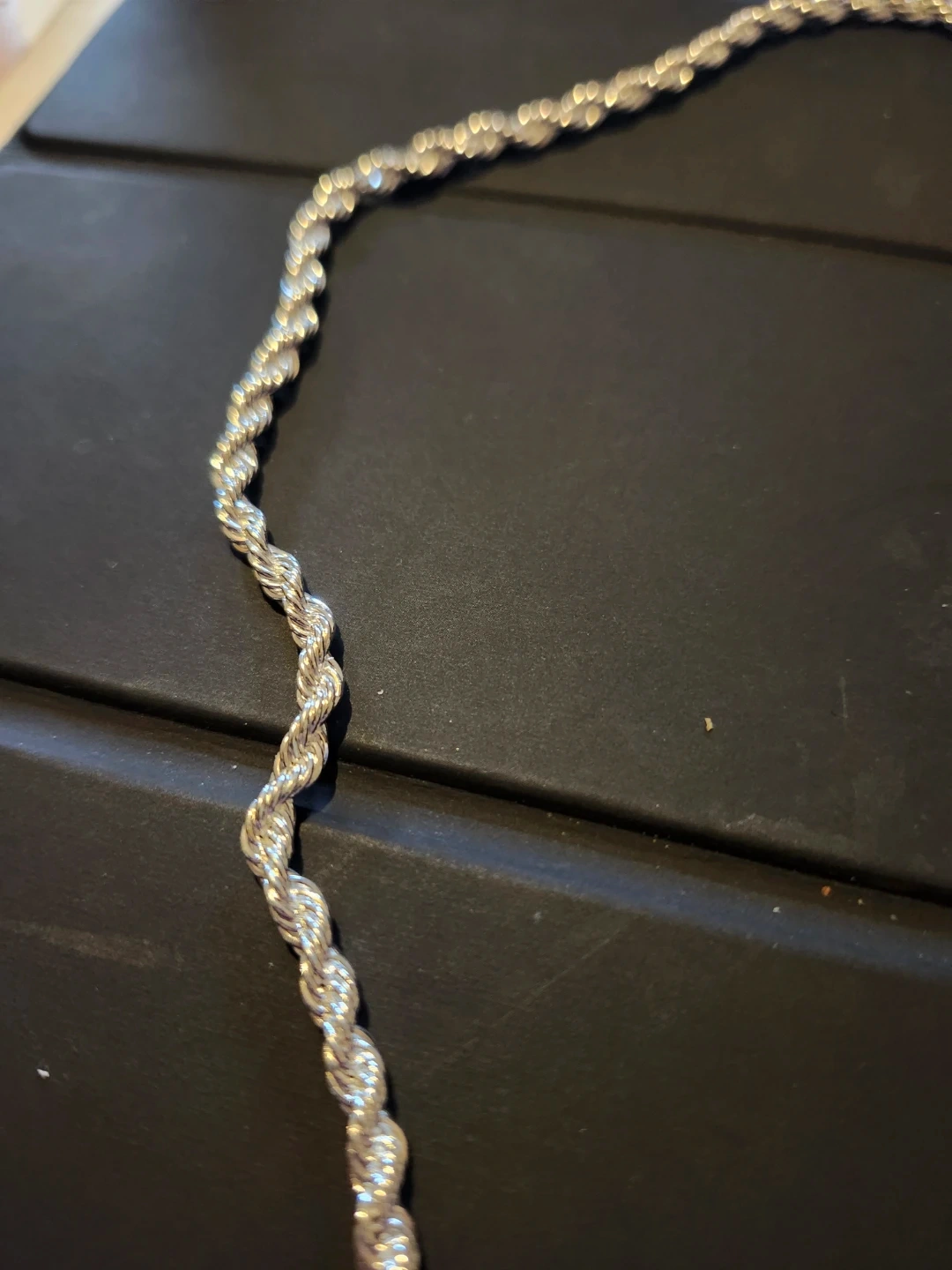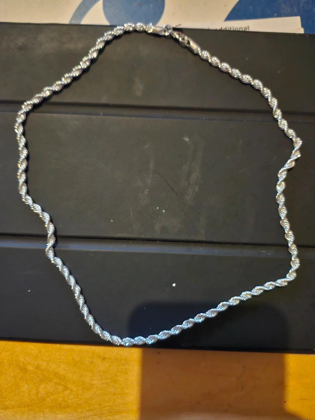 Selling a silver twisted rope chain necklace! It's in new condition and ready to wear. Perfect for adding a touch of shine to any outfit