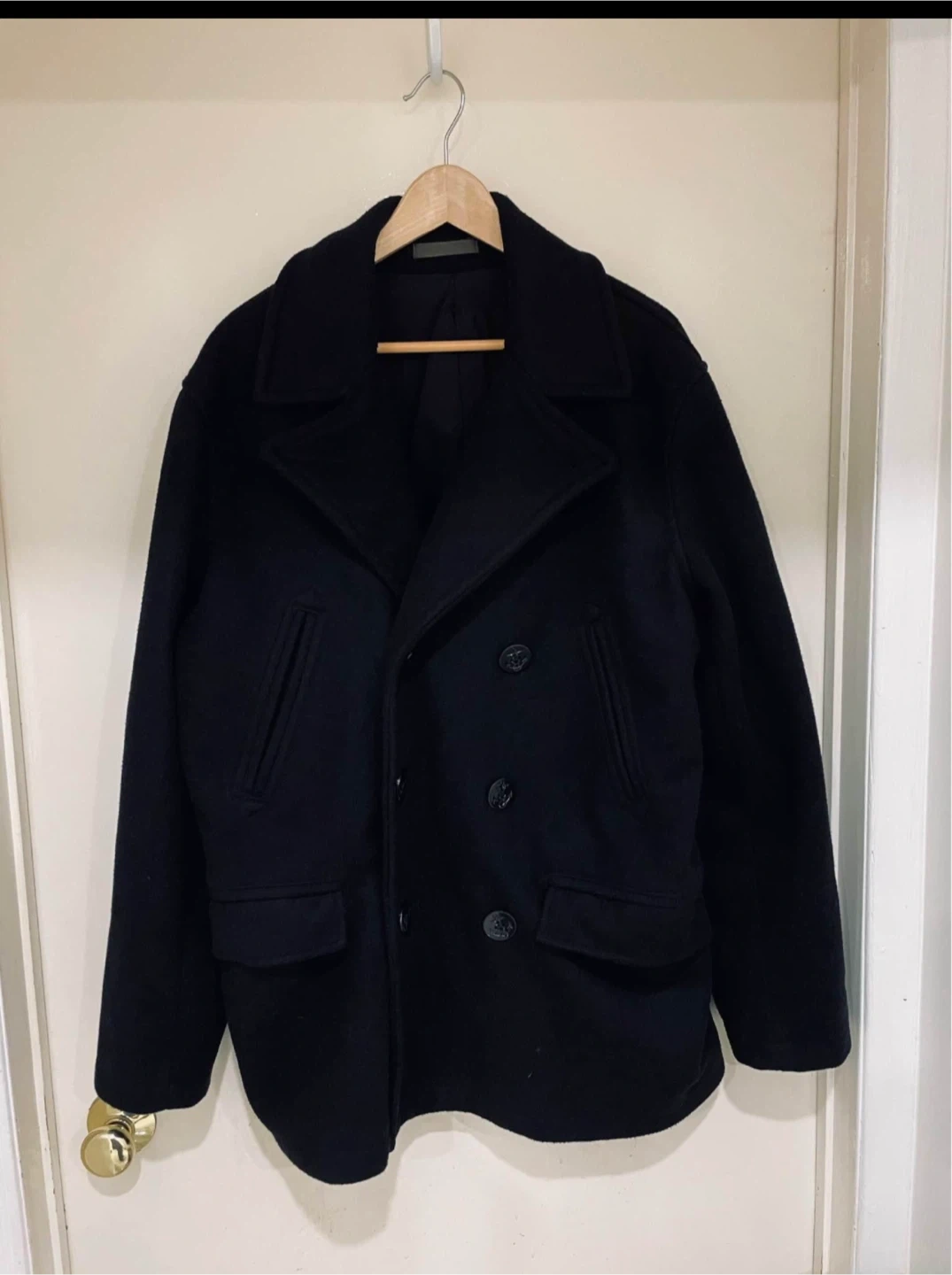 Here's a classic navy blue pea coat! It's in great condition and ready to keep you warm this season. Perfect for layering and a timeless addition to any wardrobe