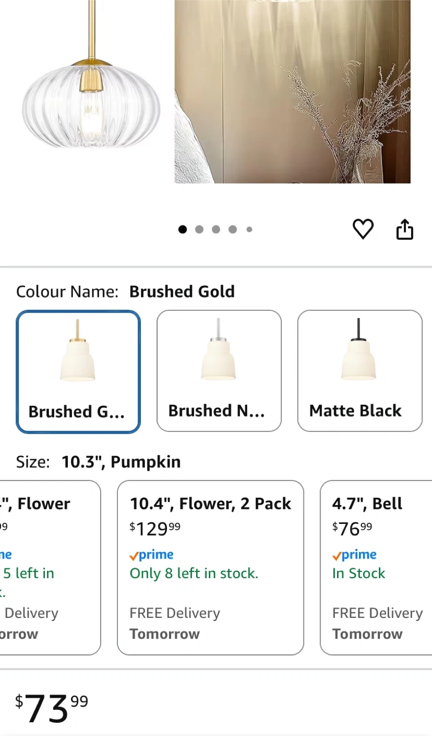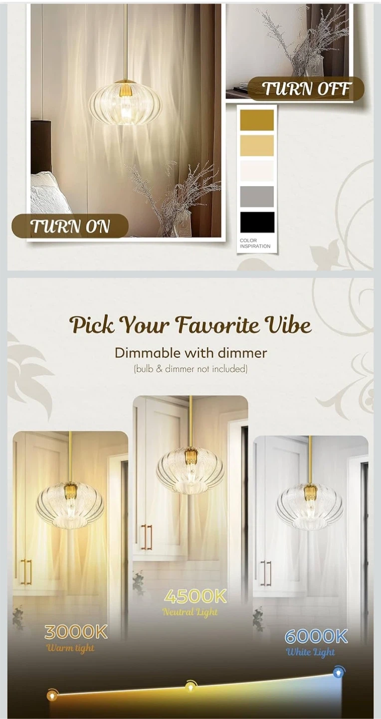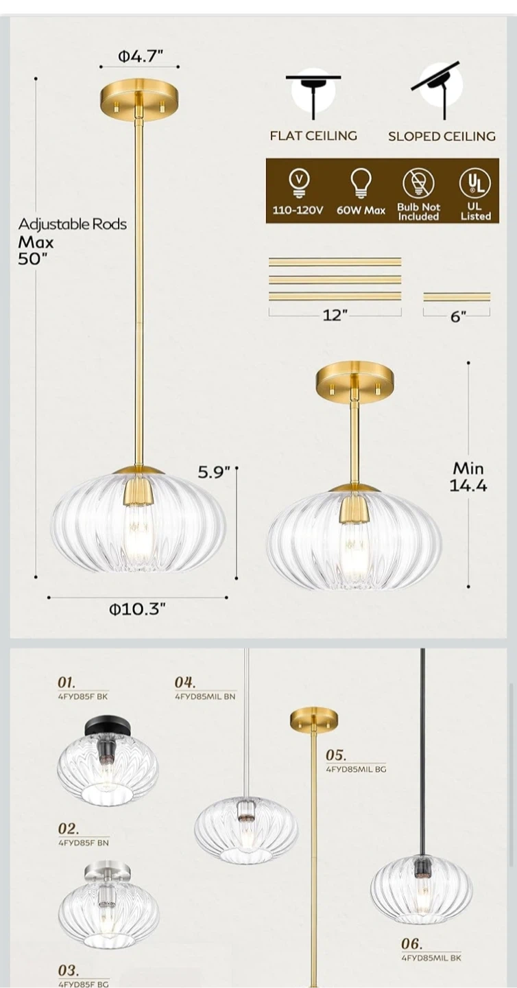 This FEMILA vintage pendant light features a high-grade brushed gold finish and a pumpkin-shaped glass shade. It's brand new in the box! The size is 10.3 inches. It has adjustable rods with a max length of 50 inches and a minimum length of 14.4 inches.