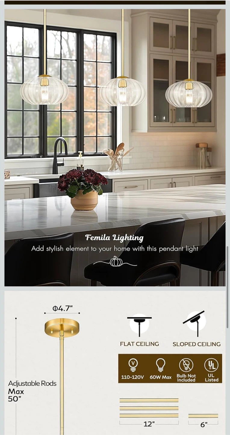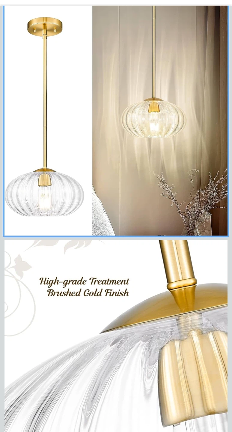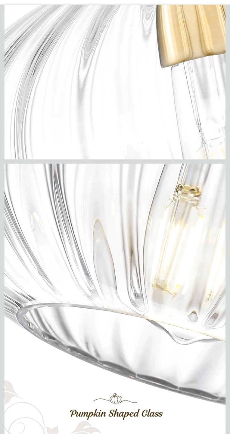 This FEMILA vintage pendant light features a high-grade brushed gold finish and a pumpkin-shaped glass shade. It's brand new in the box! The size is 10.3 inches. It has adjustable rods with a max length of 50 inches and a minimum length of 14.4 inches.