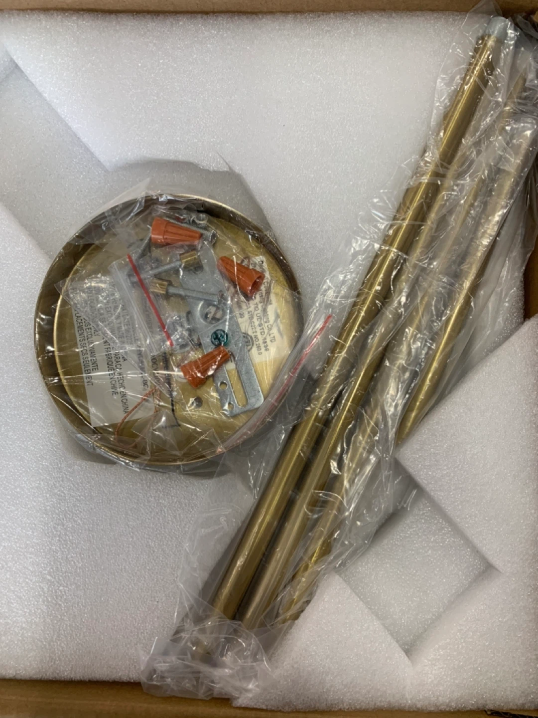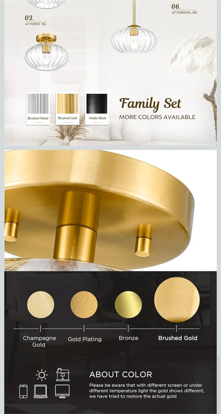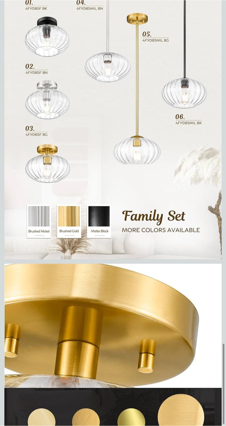 This FEMILA vintage pendant light features a high-grade brushed gold finish and a pumpkin-shaped glass shade. It's brand new in the box! The size is 10.3 inches. It has adjustable rods with a max length of 50 inches and a minimum length of 14.4 inches.