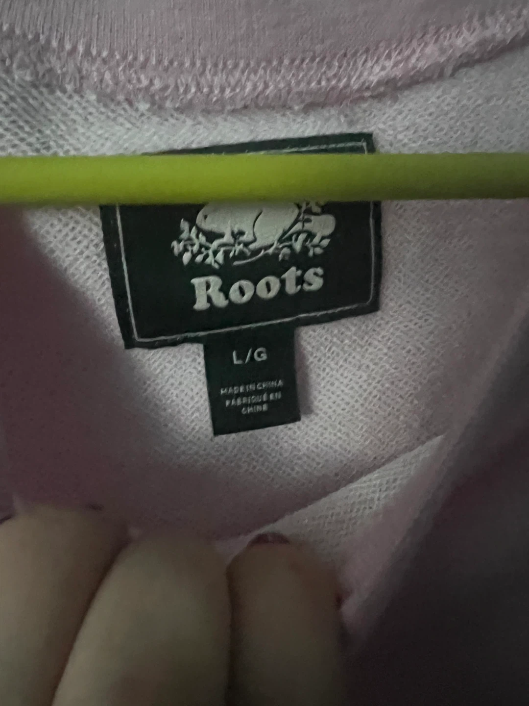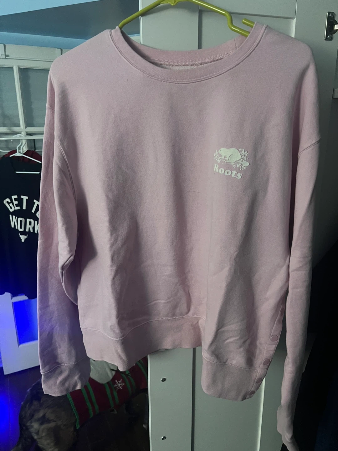 Selling a cute Roots crewneck sweatshirt in a lovely light pink! It's a size large and has some unique button detailing on the sleeves. Perfect for cozy days!