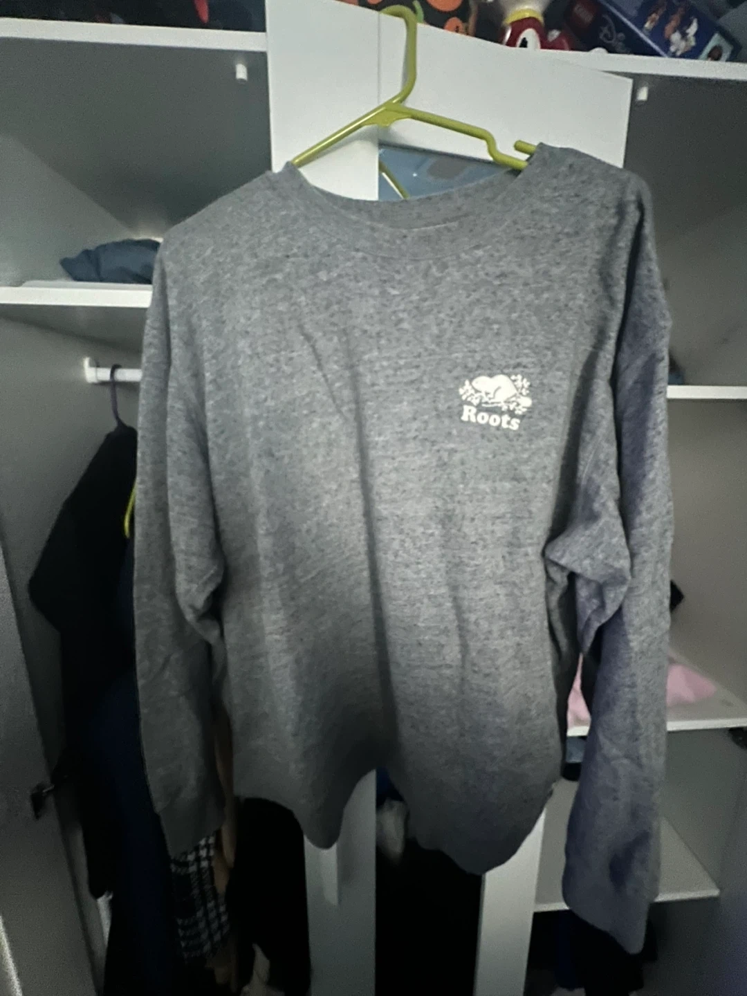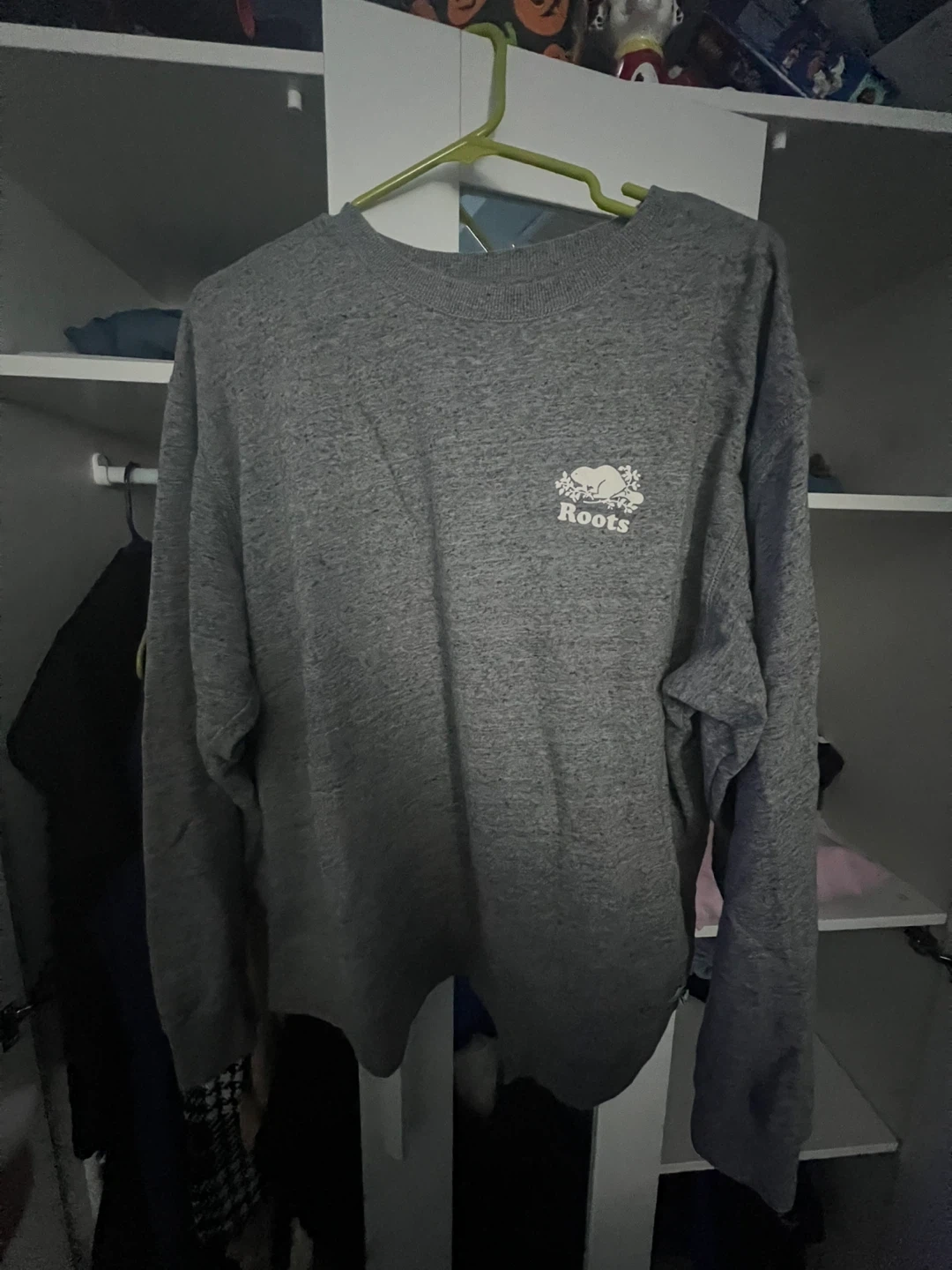 Selling a comfy Roots long sleeve shirt in grey! It's a size large and in great condition. Perfect for layering or wearing on its own!