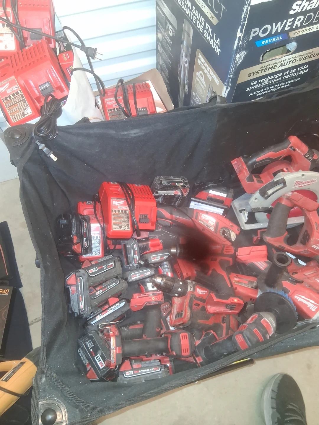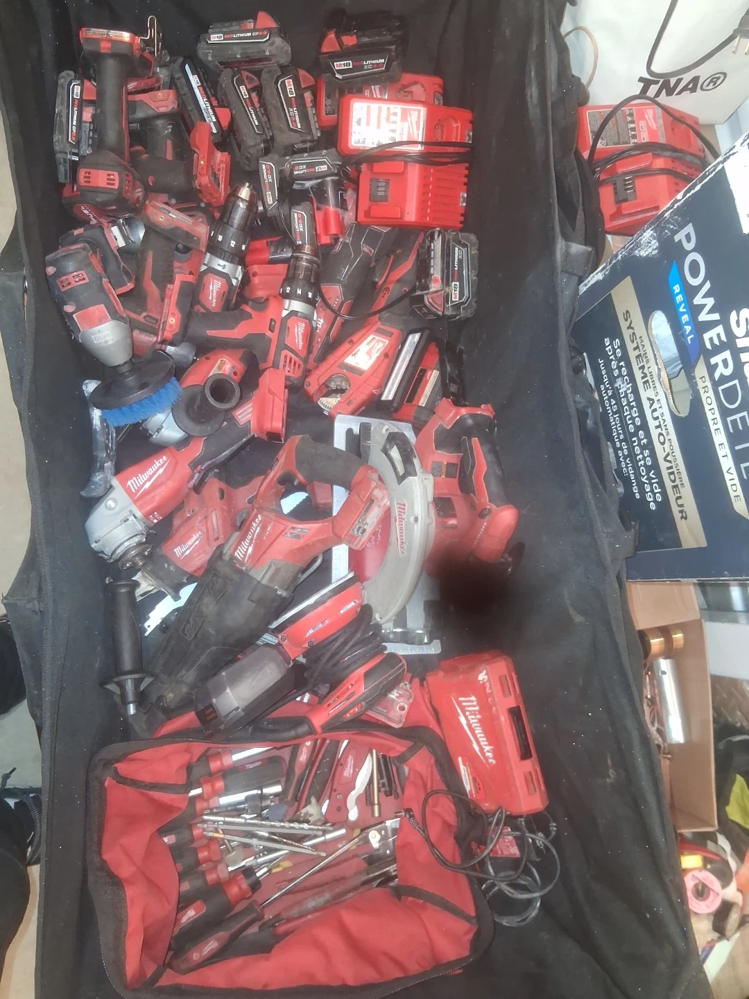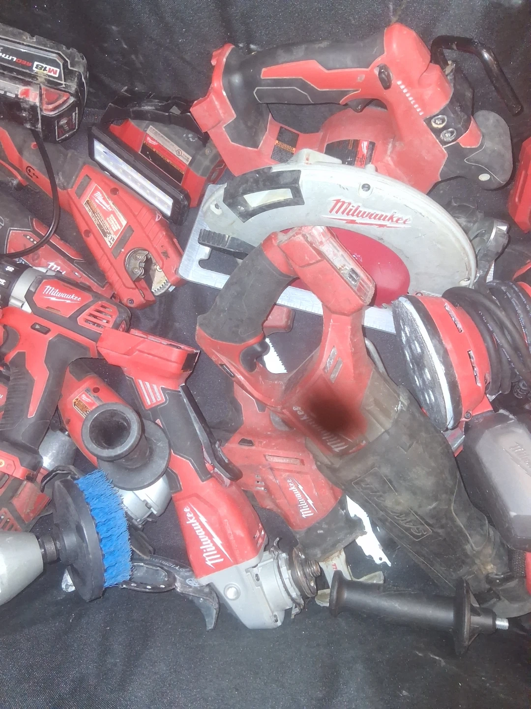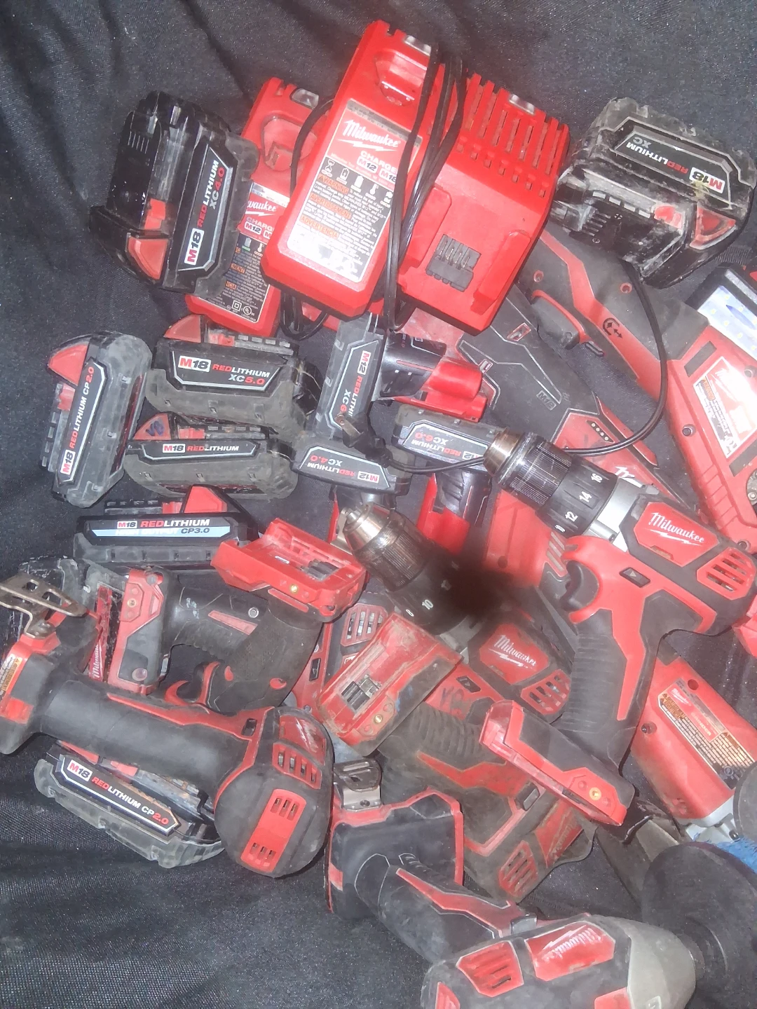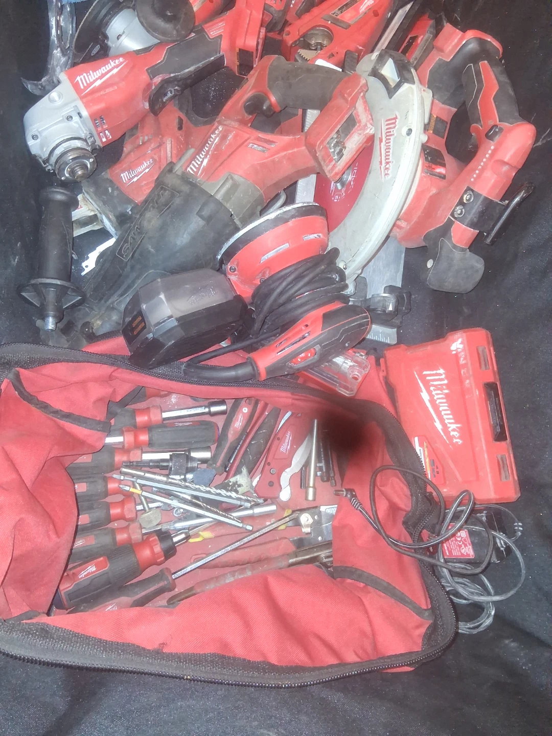 A collection of Milwaukee power tools. Includes various drills, saws, grinders, and batteries. Please see photos for details on what's included