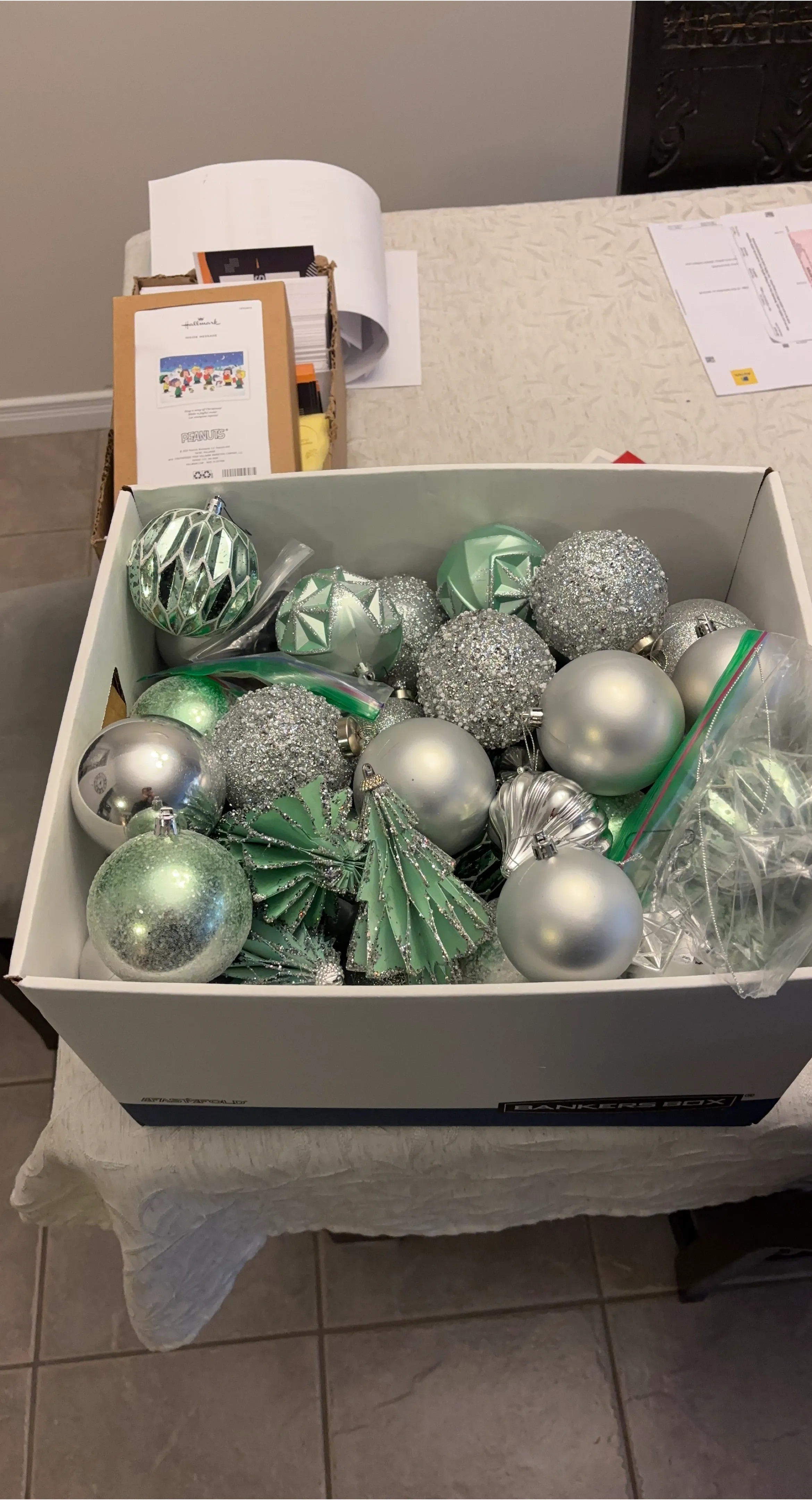 Selling a collection of Hallmark Christmas ornaments in silver and green tones! There's a variety of shapes and textures, all ready to bring some sparkle to your tree this holiday season