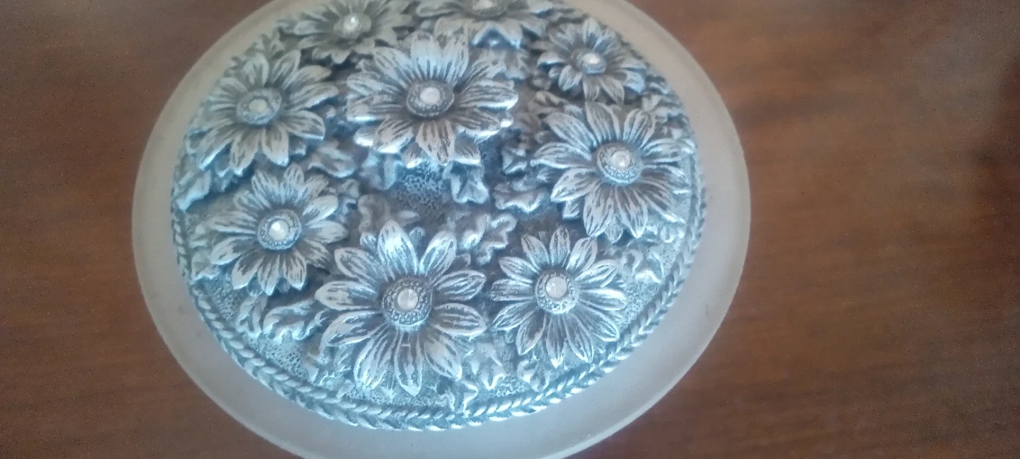 Selling a lovely trinket dish with a floral design on the lid. It has a frosted glass bowl and a decorative silver-coloured base and lid. Perfect for storing small items or as a decorative piece!