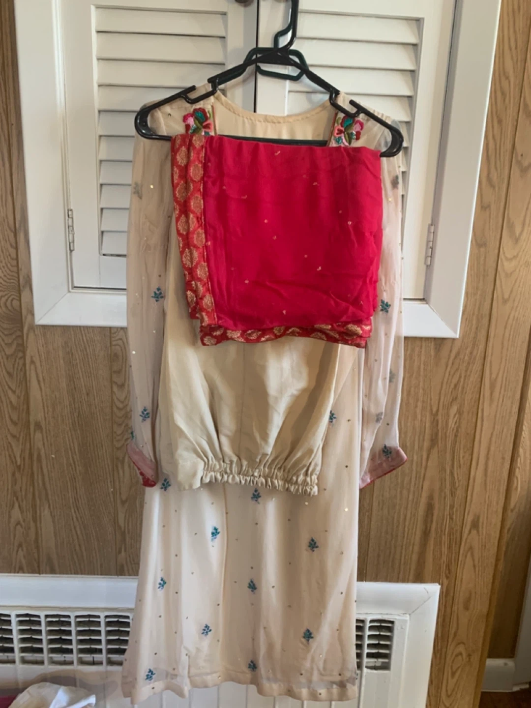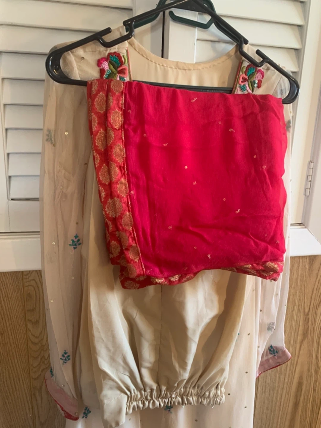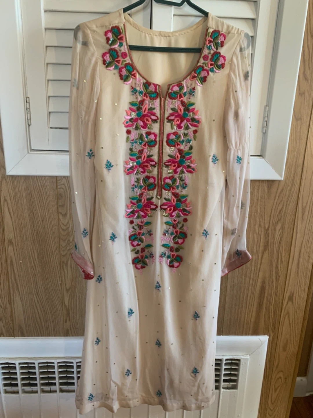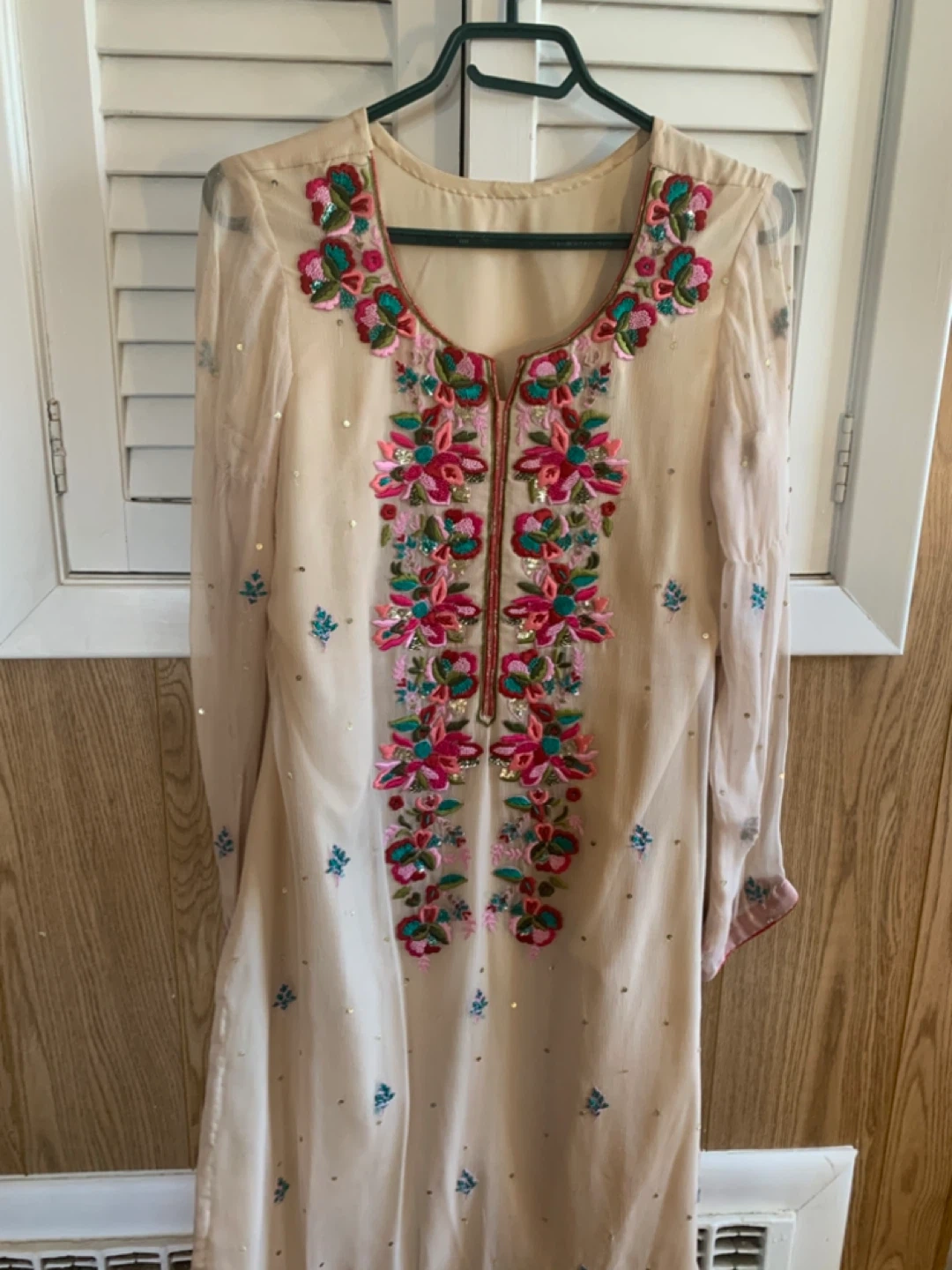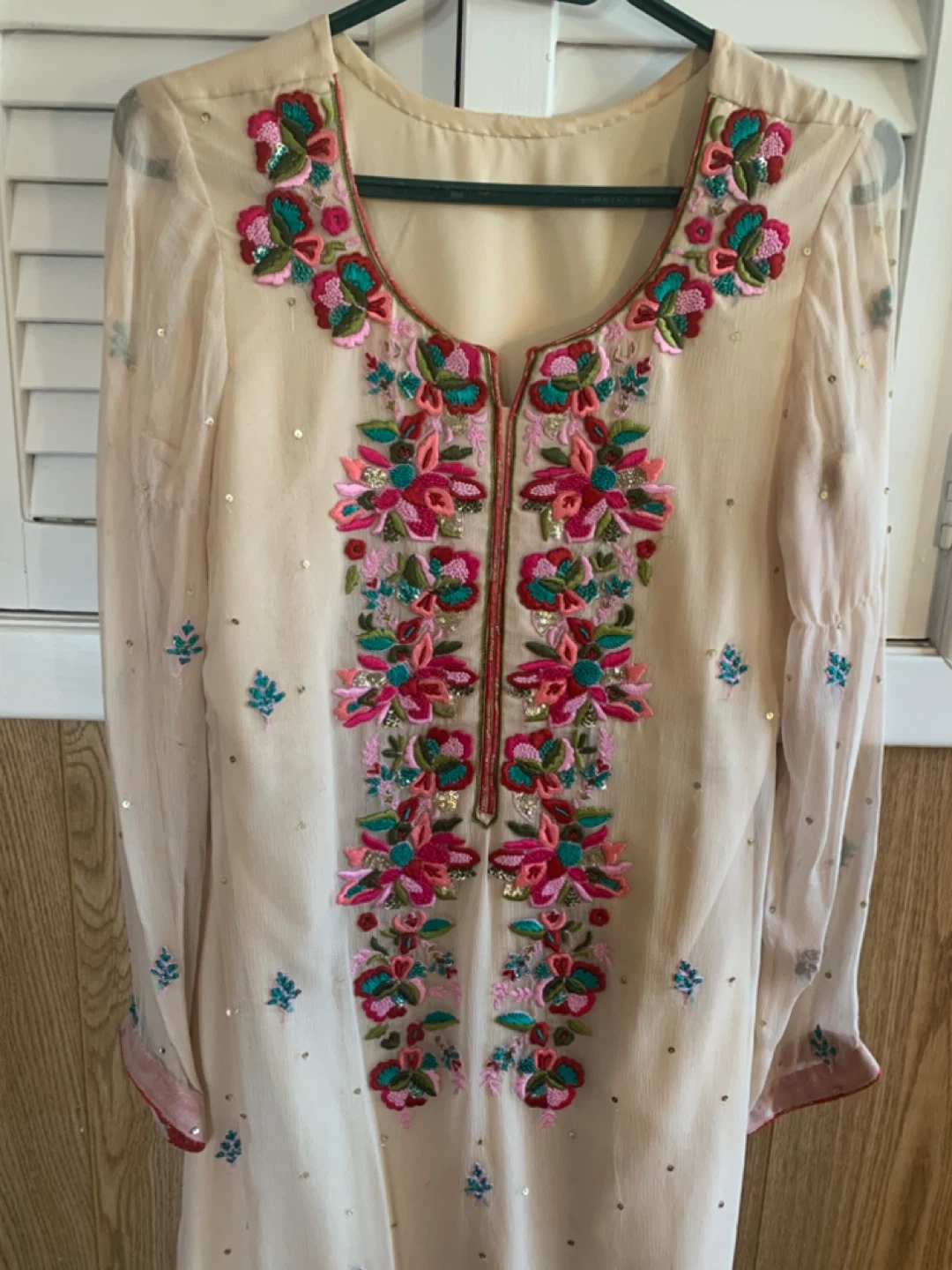 Selling a beautiful salwar kameez suit. It features intricate floral embroidery in pink, green, and blue. The fabric is a light beige color and has subtle sequin detailing. Comes with a red dupatta.