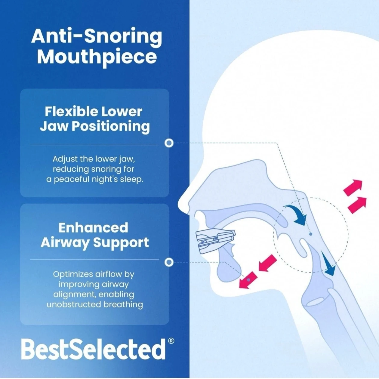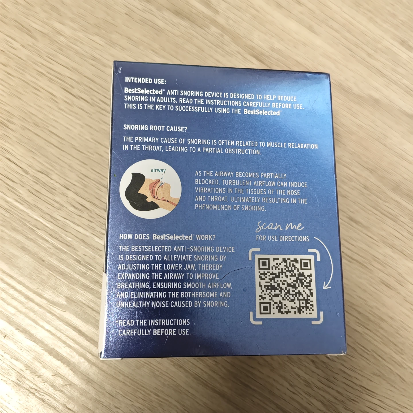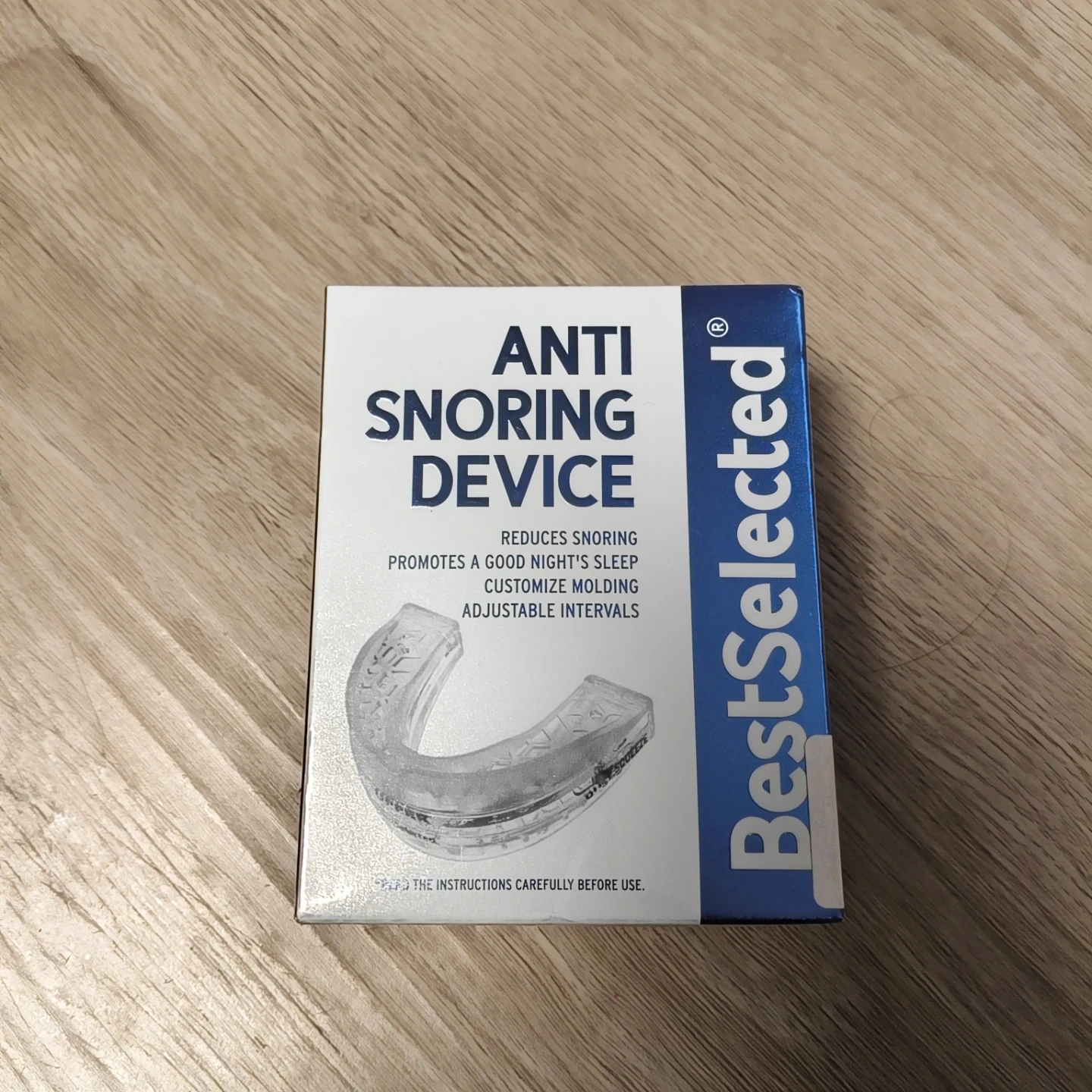I'm selling a BestSelected anti snoring device. It's designed to help reduce snoring in adults. It works by adjusting the lower jaw, thereby expanding the airway to improve breathing, ensuring smooth airflow and eliminating the bothersome and unhealthy noise caused by snoring. The box includes instructions for use