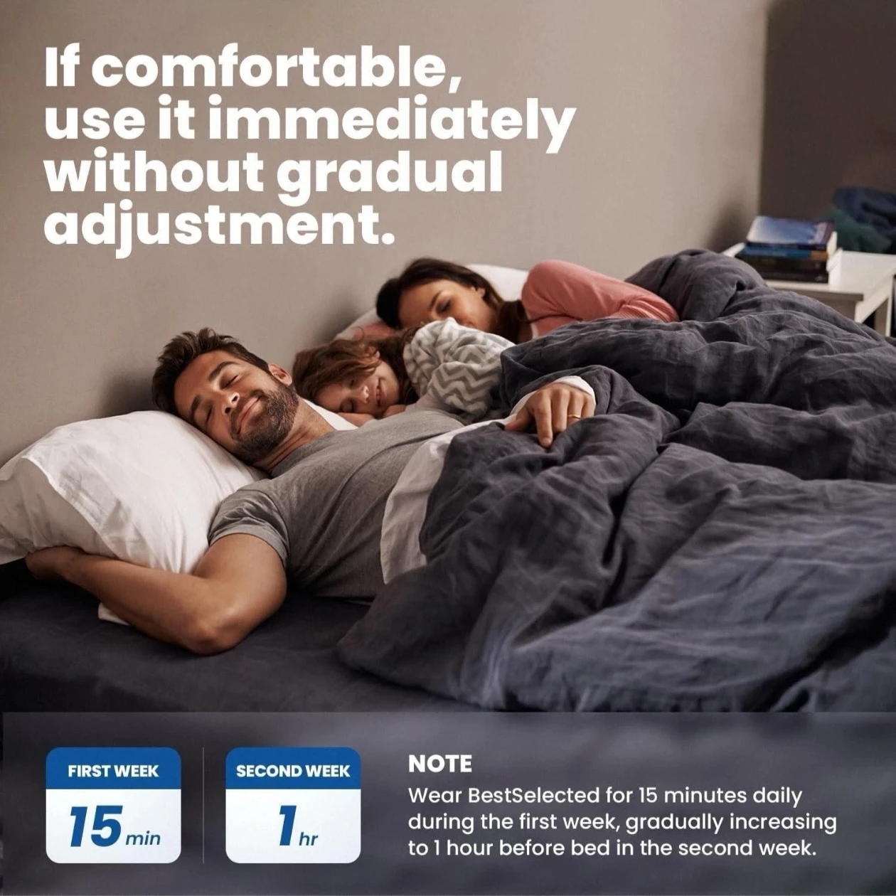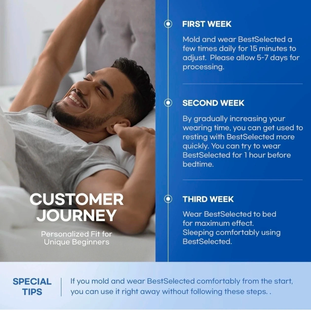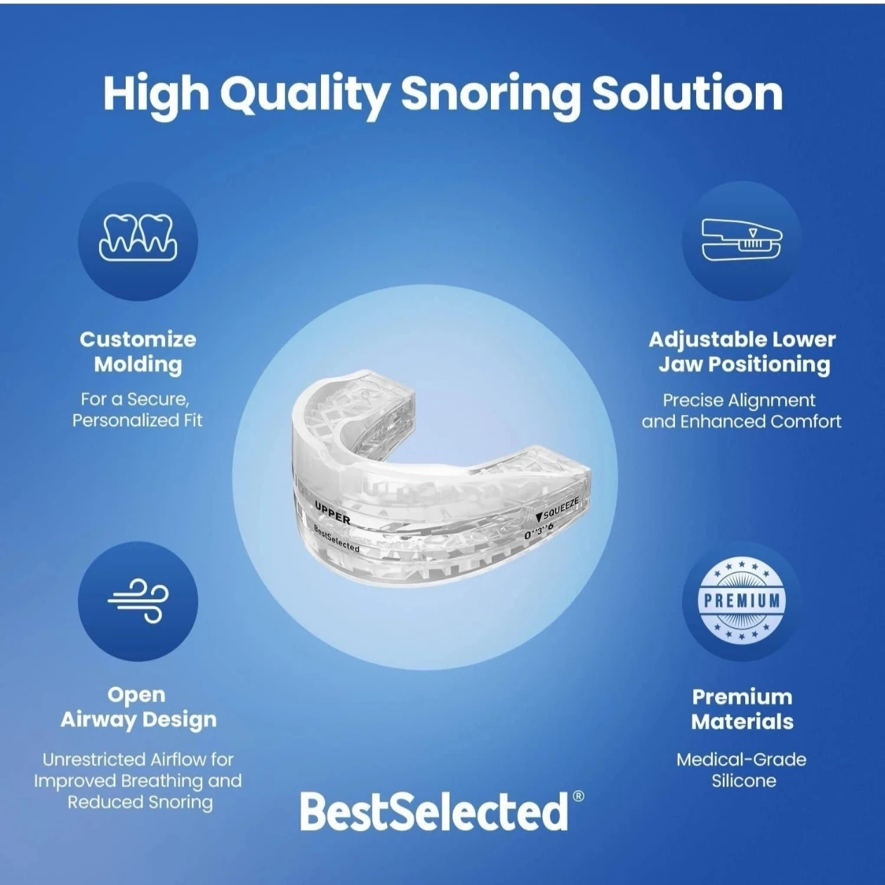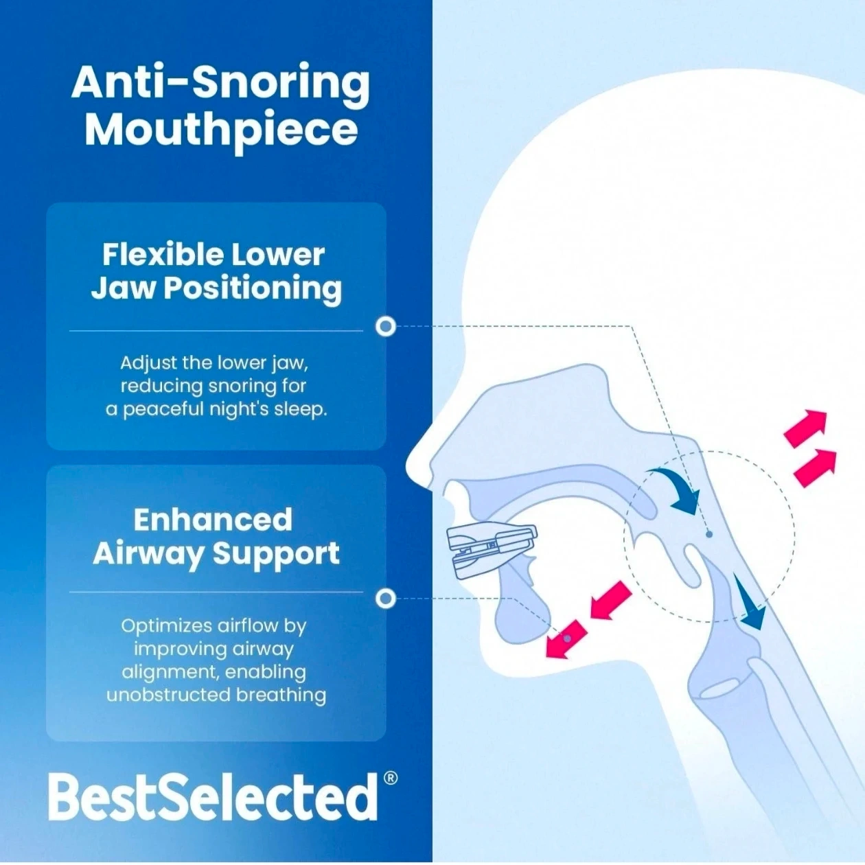 I'm selling a BestSelected anti snoring device. It's designed to help reduce snoring in adults. It works by adjusting the lower jaw, thereby expanding the airway to improve breathing, ensuring smooth airflow and eliminating the bothersome and unhealthy noise caused by snoring. The box includes instructions for use