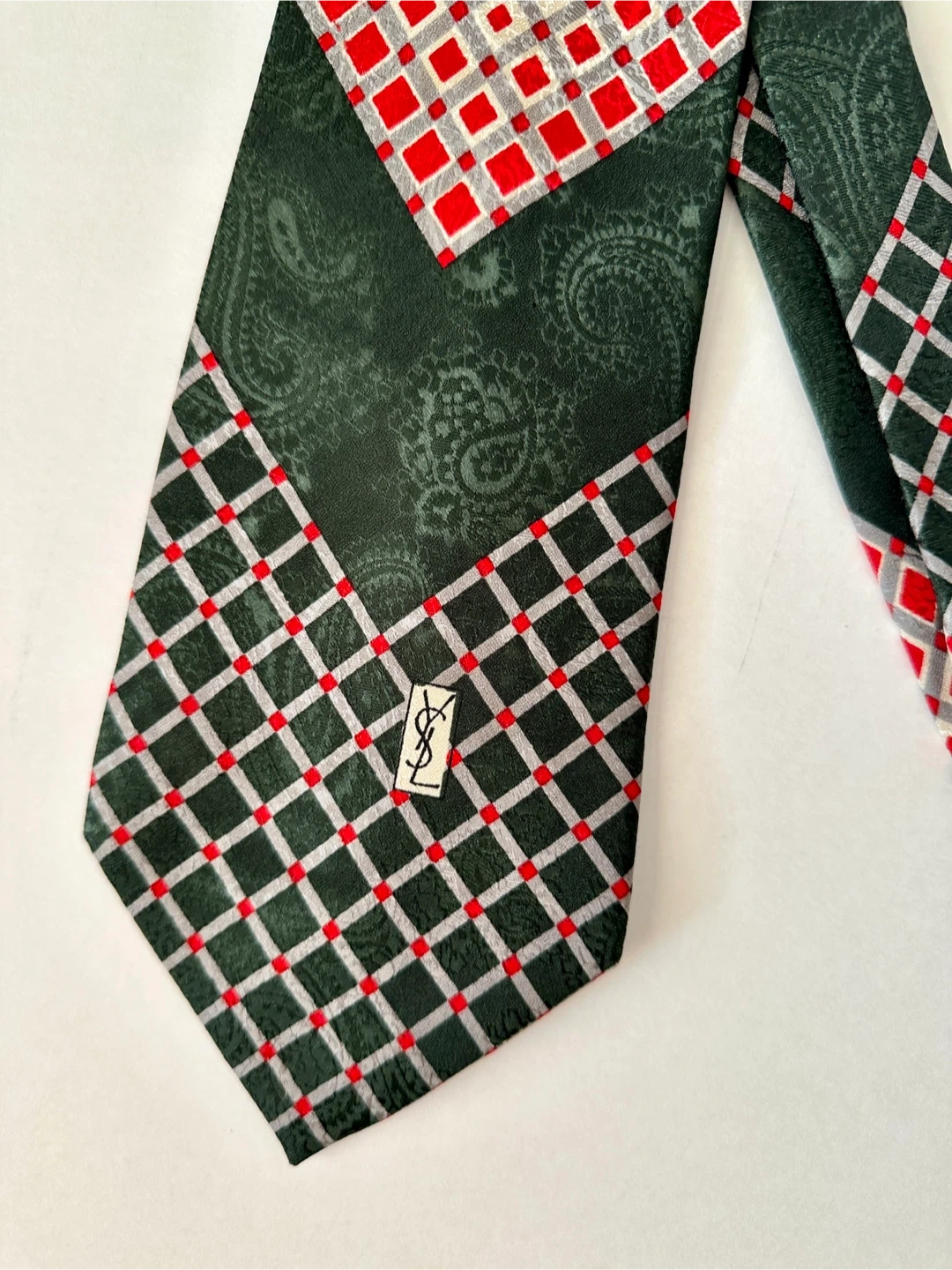 100% silk red and green Yves Saint Laurent tie. Green parts have beautiful tone on tone paisley pattern.