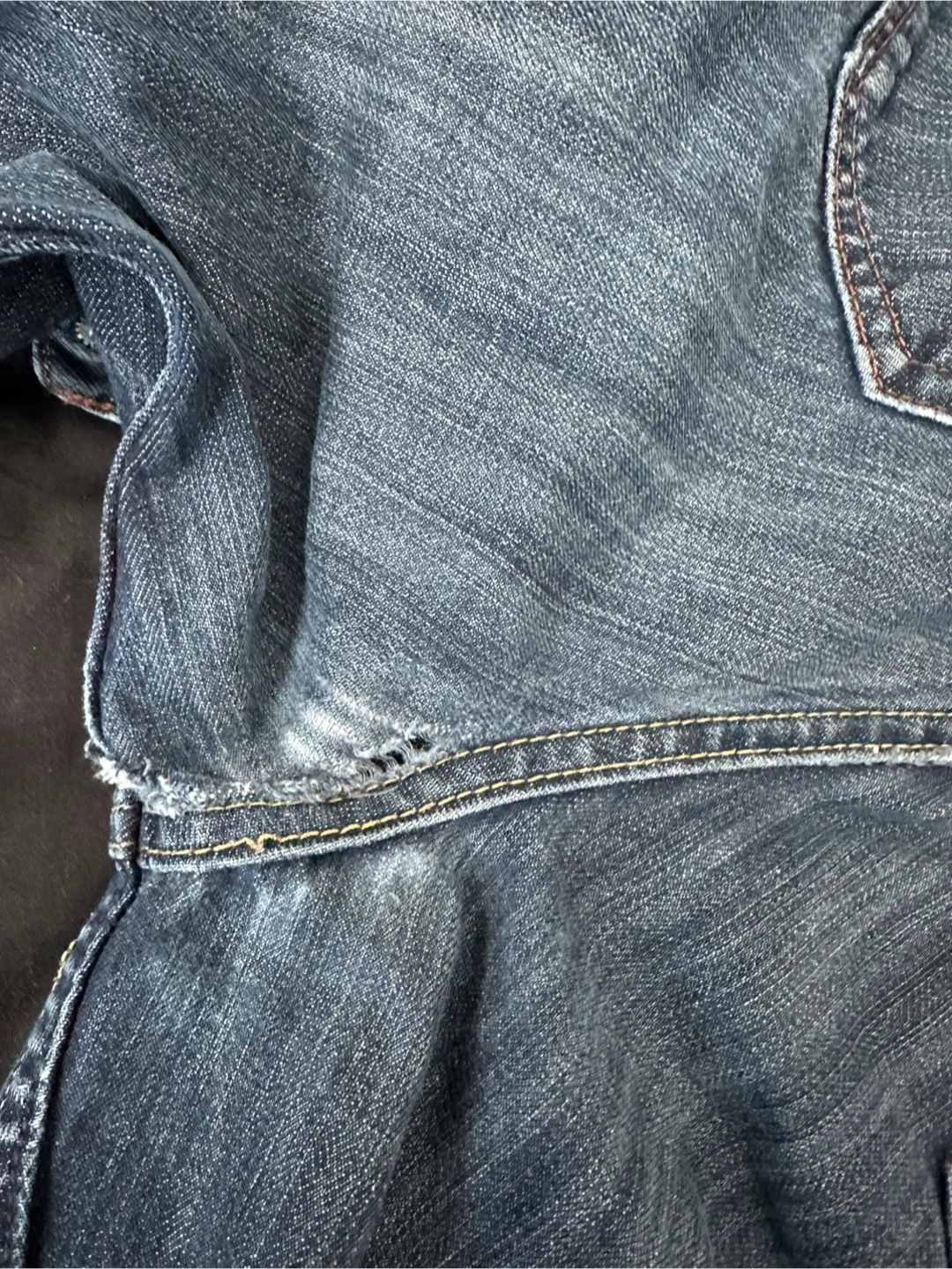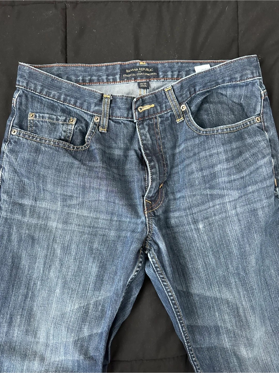 Selling a pair of Banana Republic jeans in size 32/32. They're in fair condition that could use a little stitch in the mid section as indicated on photo 3, hence the reason for a great deal. These are a straight-leg cut and a classic style.