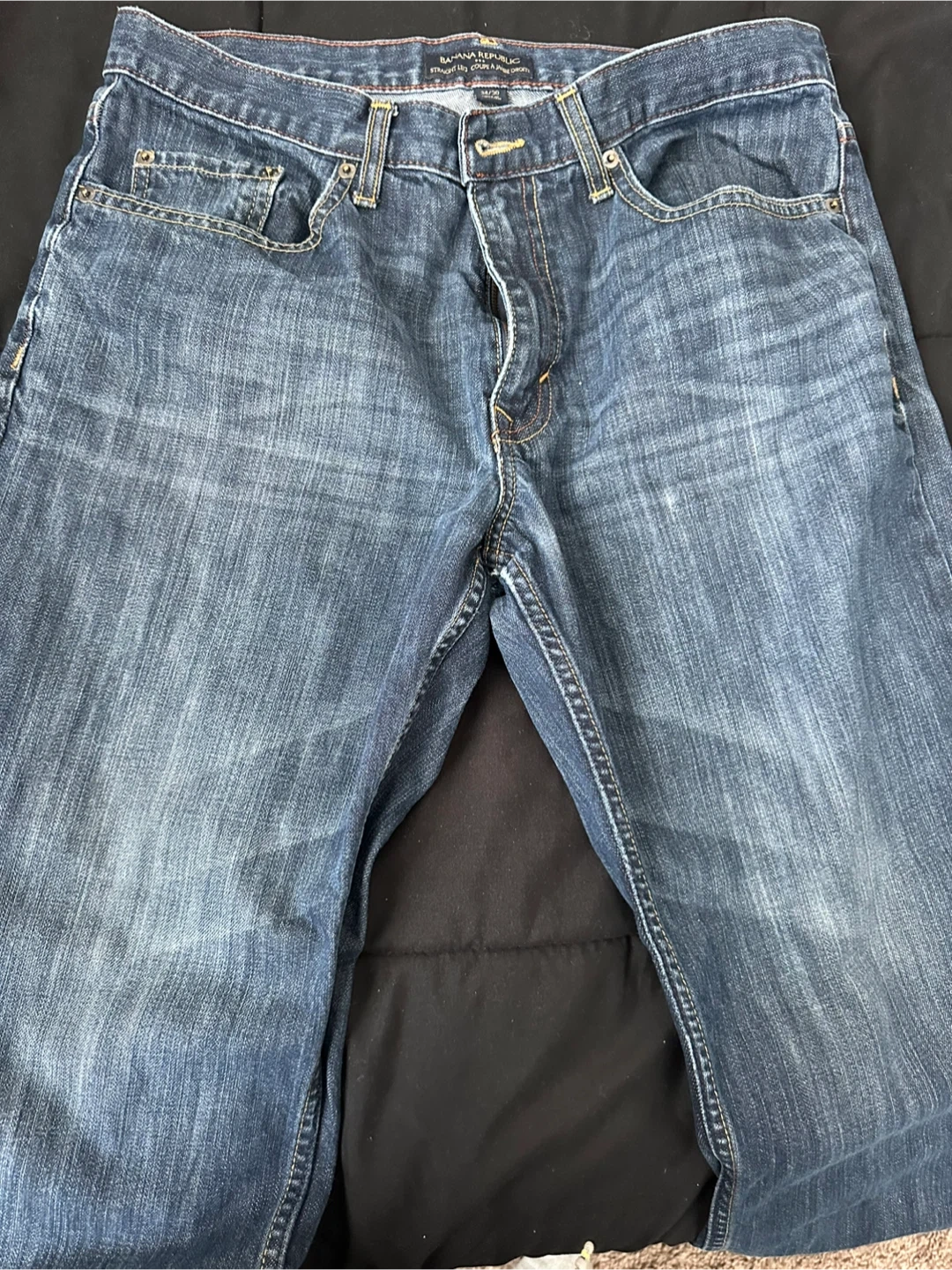 Selling a pair of Banana Republic jeans in size 32/32. They're in fair condition that could use a little stitch in the mid section as indicated on photo 3, hence the reason for a great deal. These are a straight-leg cut and a classic style.