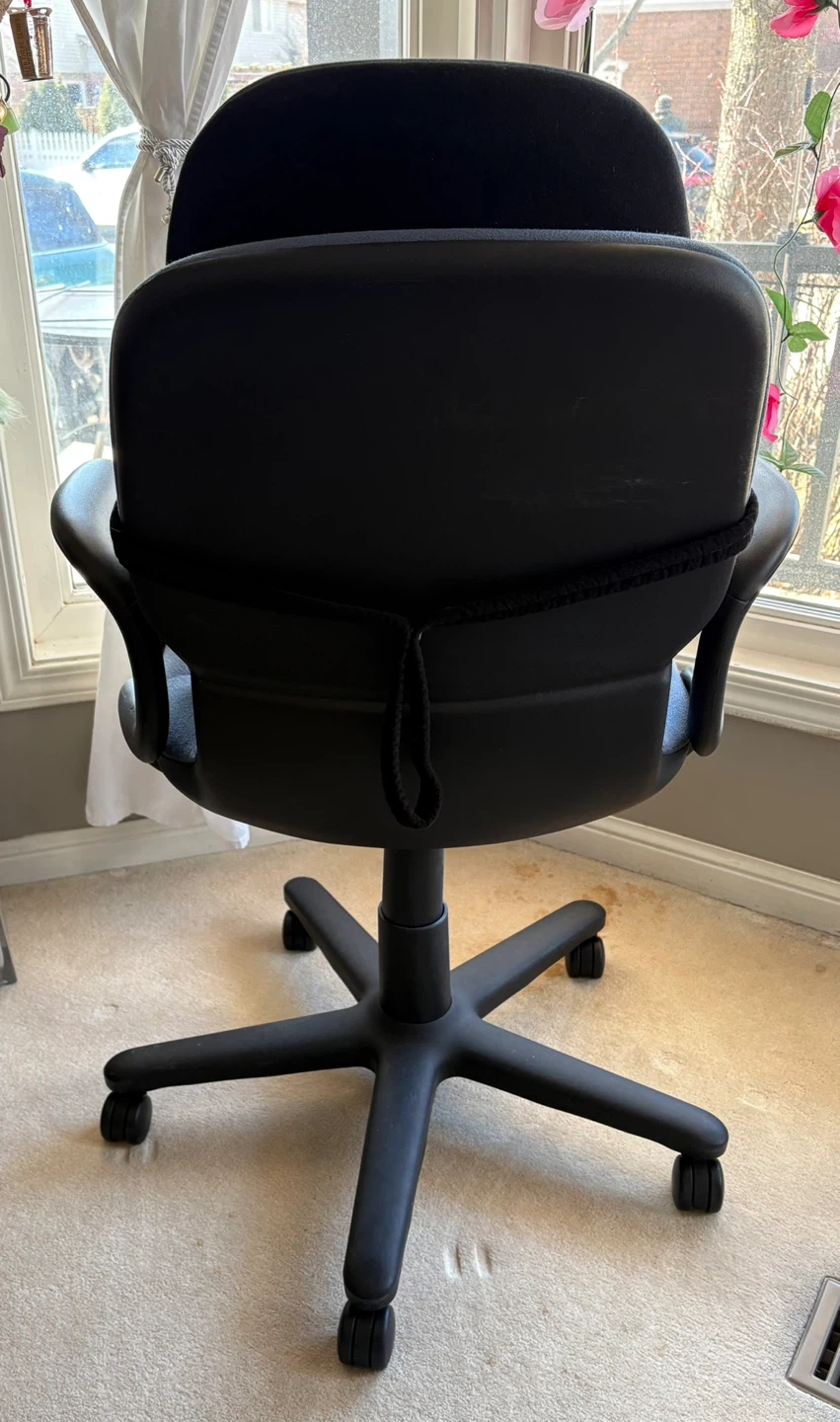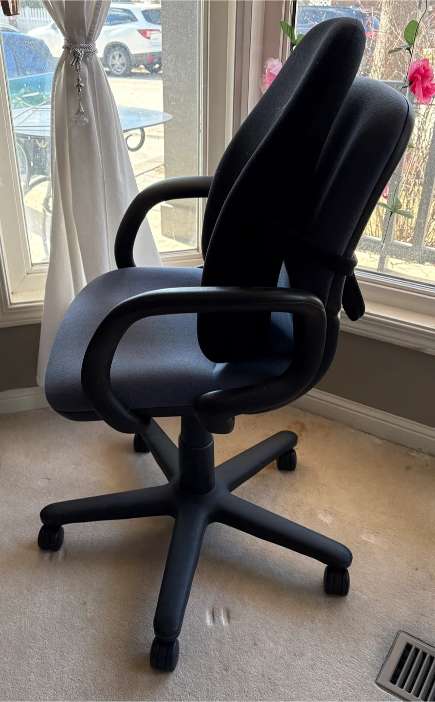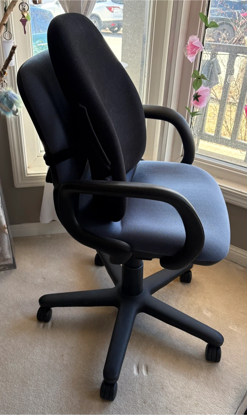 This is a standard blue office chair with adjustable height. It features a padded seat and backrest for comfort. The five-star base with casters allows for easy mobility. This chair is great for a home office or workspace.