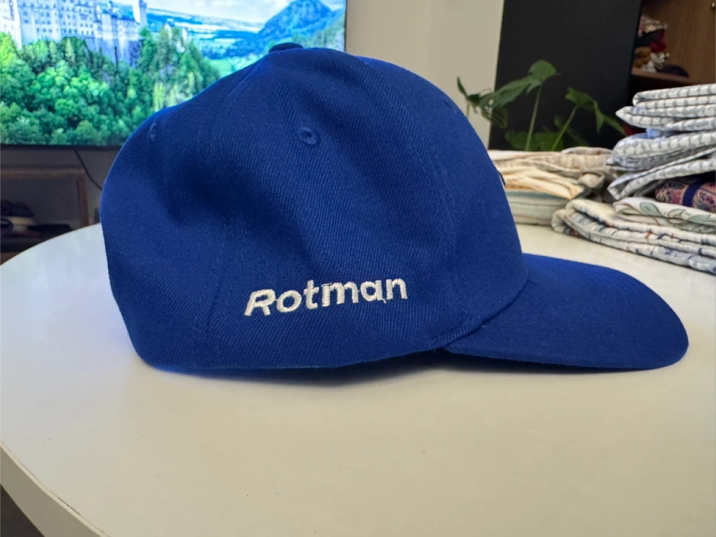 This is a blue Toronto Blue Jays baseball cap with "Rotman" embroidered on the side. It's made of 100% polyester. This cap is great for any Jays fan looking to show their team spirit!