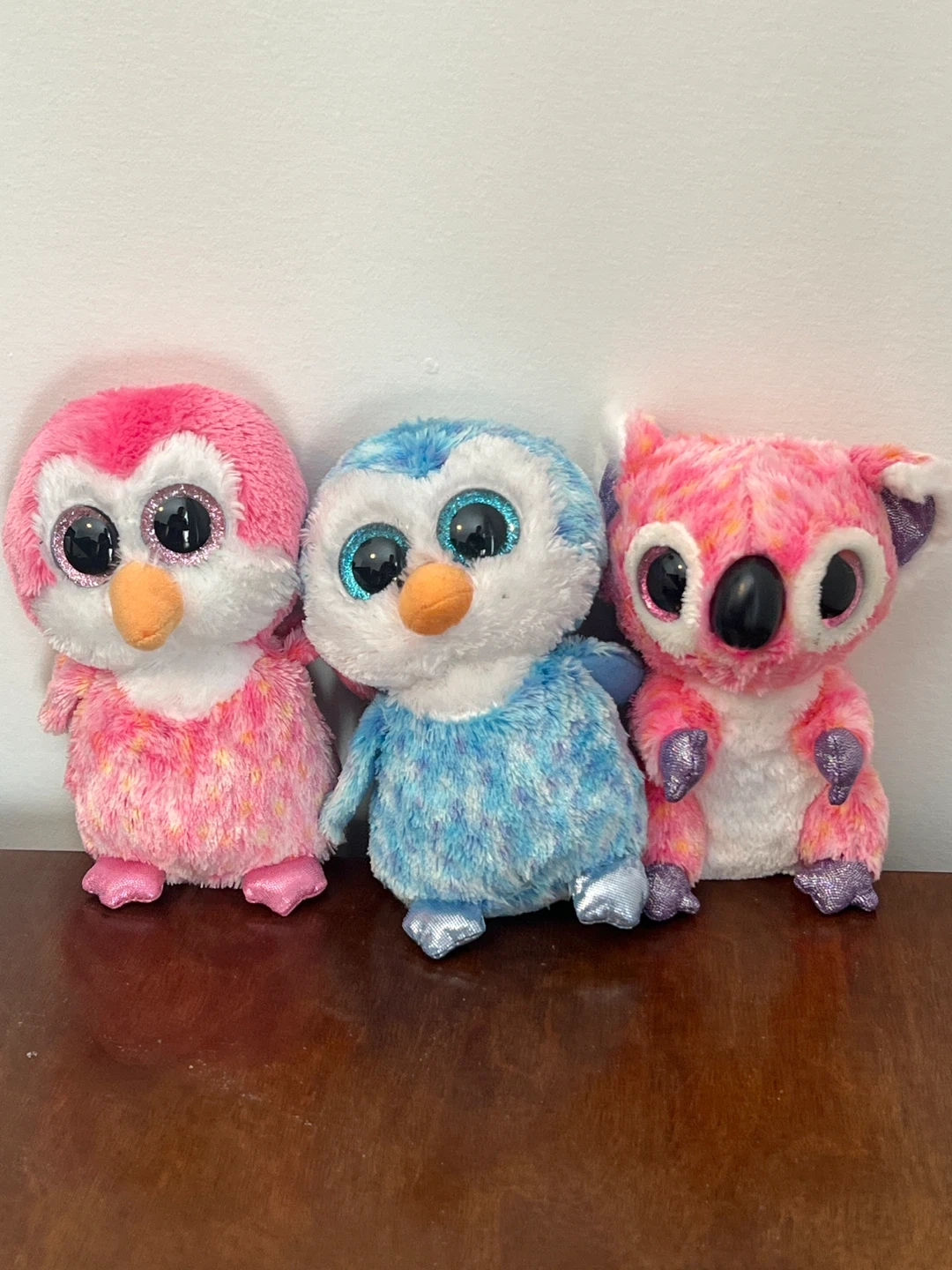 Three adorable Ty Beanie Boos stuffed animals. One pink and white penguin, one blue and white bird, and one pink and yellow koala. They have large, sparkly eyes and soft, fluffy fur.