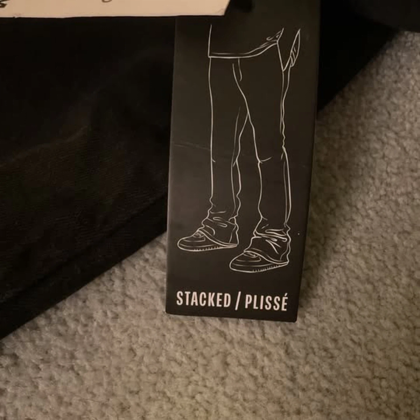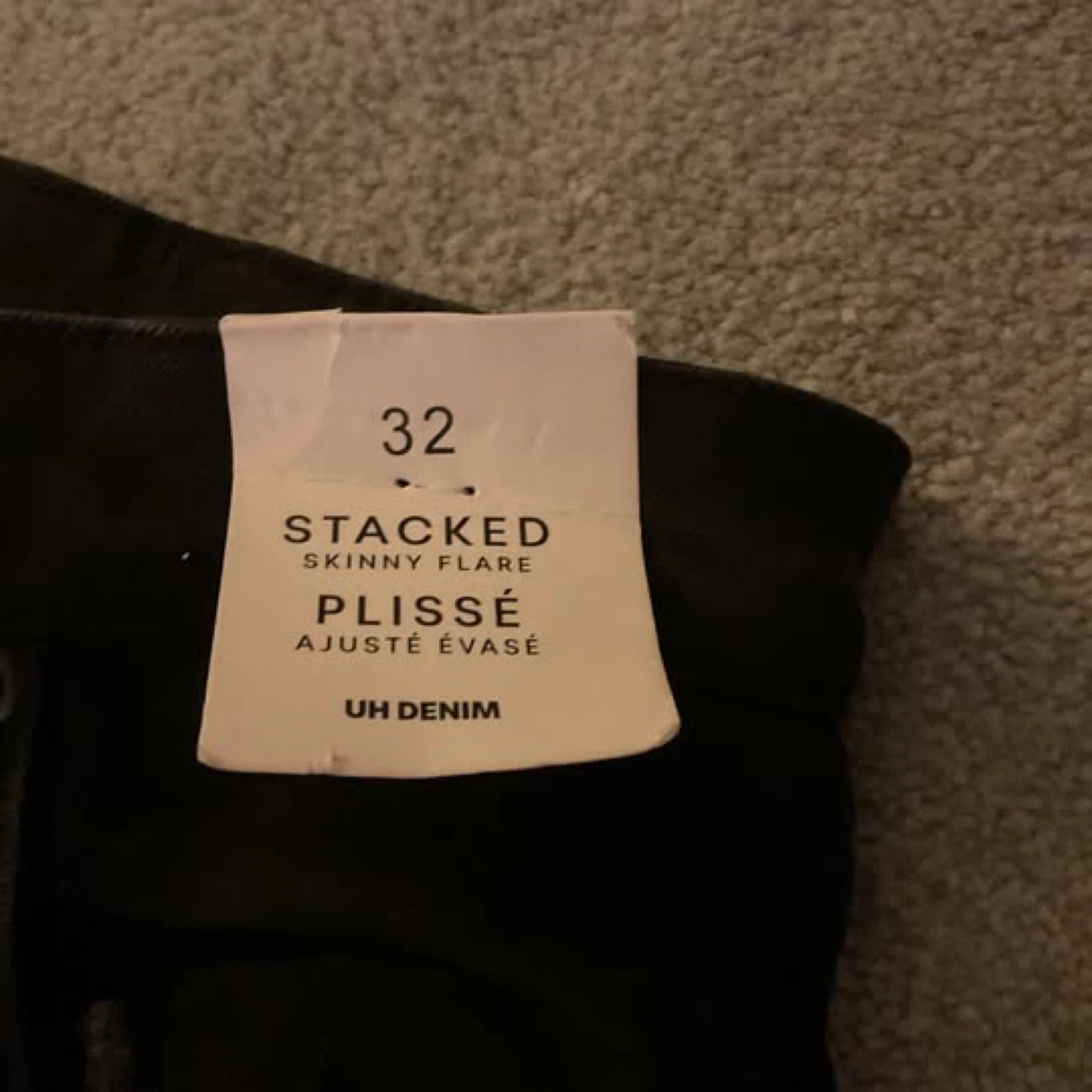 These black UH DENIM jeans feature a stacked skinny flare fit. They are a size 32 with ripped detailing on the knees. These pants are designed with a plissé adjusted hem.